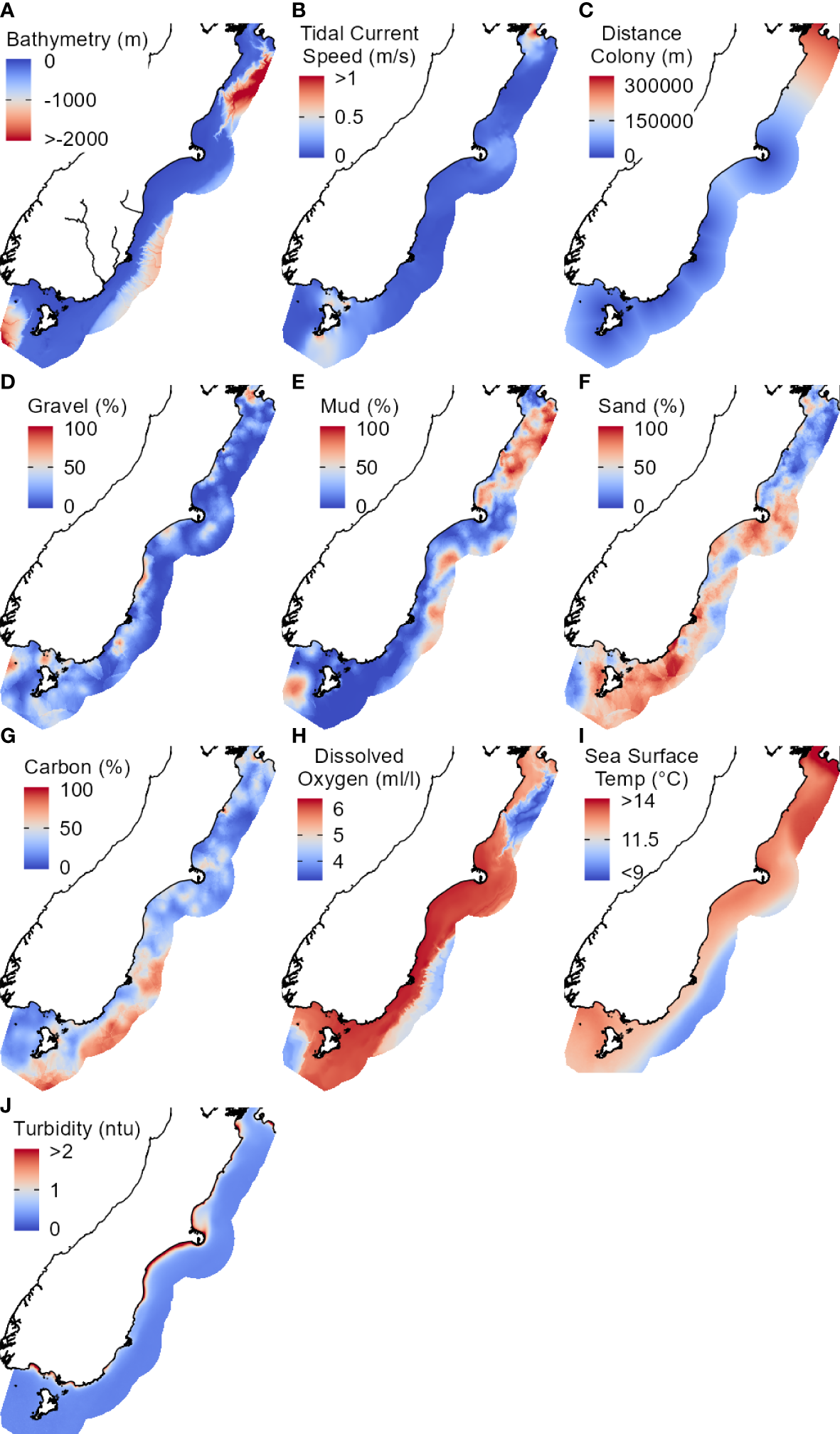 To avoid multicollinearity in the models, we removed collinear predictors with Spearman’s correlation coefficients > 0.7 or with variable inflation factors (VIF) > 10 (Dormann et al., 2013) using the usdm package (v1.1-18) (Naimi et al., 2014). See Supplementary Material Figure 1 for the correlation matrix created using the corrplot package (v0.84) (Wei and Simko, 2017). Some multicollinearity is acceptable in Maxent (Elith et al., 2011), so we subjectively retained several predictors that were hypothesised to be highly important for penguin distribution (e.g., bathymetry, seafloor sediment type). A final dataset of ten predictors were used for modelling (Figure 2): bathymetry, distcolony, current, mud, gravel, sand, carbon, sf_do, sst_mean, and turb_mean.