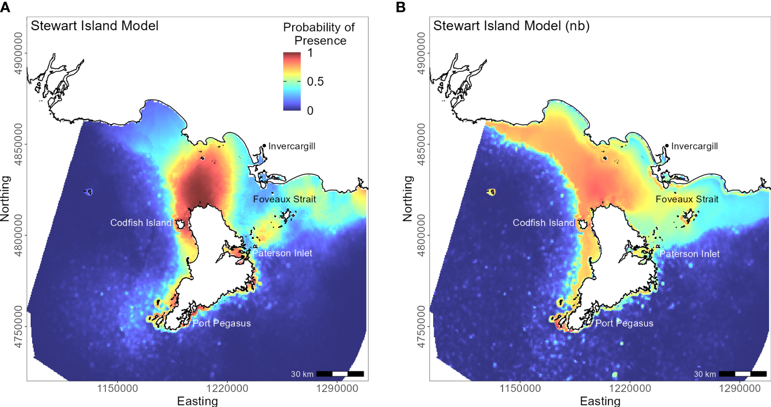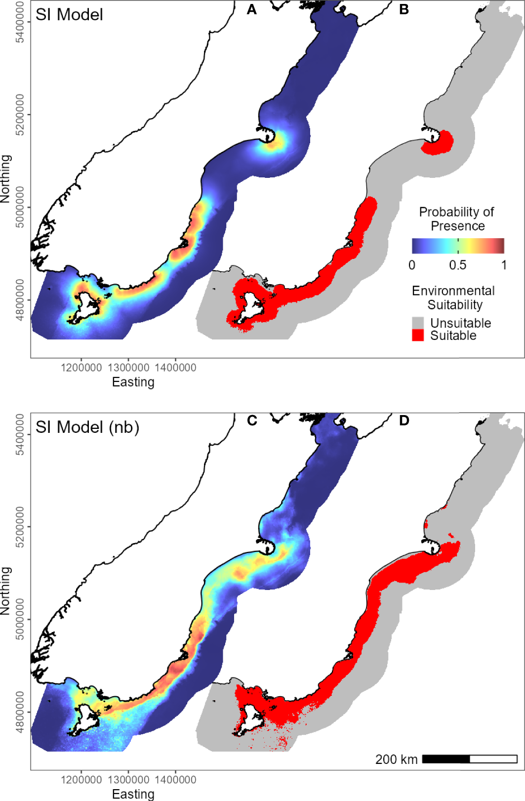 We converted the South Island model predictions into a binary environmental suitability map (Freeman and Moisen, 2008; Liu et al., 2016). This map was derived from a threshold method that assumed all areas with a predicted probability of presence equal to or greater than a certain threshold had environmental conditions suitable for occurrence (Ludynia et al., 2013; Hunter-Ayad et al., 2021). We chose a threshold that maximised the sum of sensitivity (true positive rate) and specificity (true negative rate), such that positive presences are just as likely to be incorrect as background points (Freeman and Moisen, 2008; Liu et al., 2016; Hunter-Ayad et al., 2021). The thresholds were 0.30 and 0.35 for the SI and SI (nb) models, respectively.