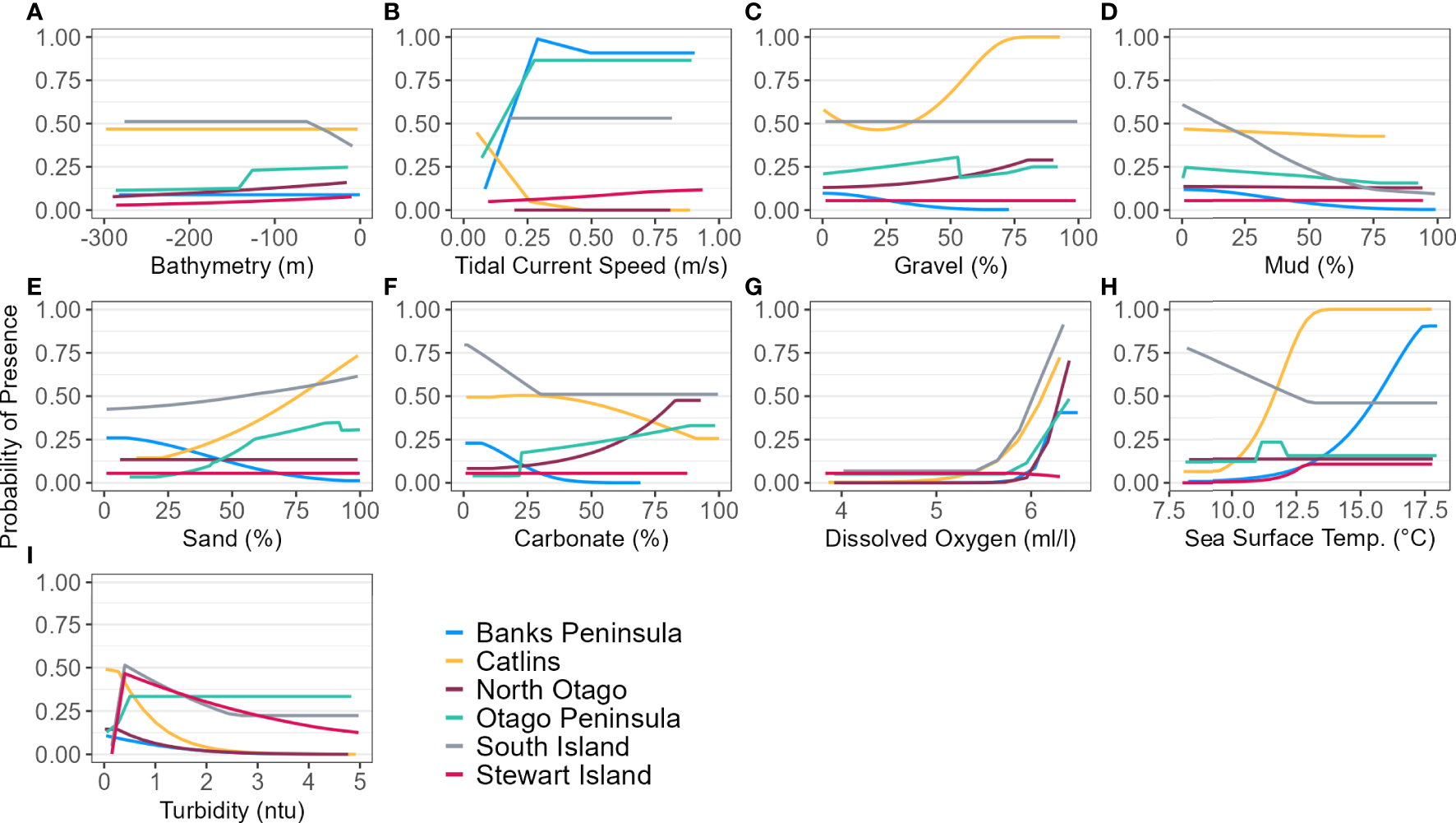 The endangered yellow-eyed penguin (Megadyptes antipodes; hoiho or takaraka in te reo Māori) is endemic to the South Island/Te Wai Pounamu of New Zealand/Aotearoa, Stewart Island/Rakiura and adjacent islands, and the Subantarctic Auckland Islands/Motu Maha and Campbell Island/Motu Ihupuku (BirdLife International, 2020). As specialised, inshore, benthic foragers, yellow-eyed penguins exploit the predictability of prey at the seafloor (Mattern et al., 2013). Several studies have hypothesised that bathymetry (Moore et al., 1995; Moore, 1999; Mattern et al., 2007; Mattern, 2020), seafloor sediment type (Mattern et al., 2013; Mattern et al., 2018a; Mattern and Ellenberg, 2018; Mattern, 2020), water properties such as salinity and currents (Moore et al., 1995), and seafloor structures (Mattern et al., 2013; Mattern et al., 2018a) influence yellow-eyed penguin distribution and habitat selection. Sea surface temperatures have also been related to adult survival and breeding success (Peacock et al., 2000; Mattern et al., 2017). Productive regions around current systems and frontal zones are important areas for many pelagic foraging seabird and penguin species (Hull et al., 1997; Boersma and Rebstock, 2009; Bost et al., 2009; Mattern et al., 2018b). In New Zealand, the northward flowing Southland Current is bounded by the Subtropical Front where Subtropical and Subantarctic waters meet (Gorman et al., 2013; Stevens et al., 2019; Stephenson et al., 2020). These currents and fronts extend to the seafloor during parts of the year due to the shallow (<150m) continental shelf around the South Island (Hopkins et al., 2010; Stevens et al., 2019), which could directly influence benthic foraging yellow-eyed penguins. While the benthos is generally less impacted by these dynamic systems, they do facilitate areas of high productivity throughout the water column. This heterogeneity in productivity is likely to result in varying habitat suitability for specific subpopulations of penguins across different geographic regions.