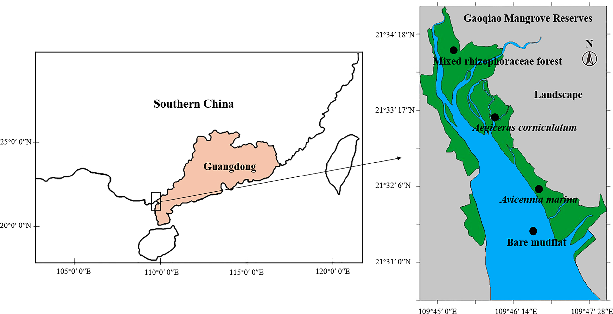 A natural mangrove reserve located in Gaoqiao, Zhanjiang City, Guangdong Province, China, was selected since it is one of the largest mangrove natural reserves in China. This region has a subtropical monsoon climate, with an average annual temperature of 23.4 °C and average annual precipitation of 1816 mm (mainly from April to September). Mangrove species colonization is partially controlled by terrain and tide.