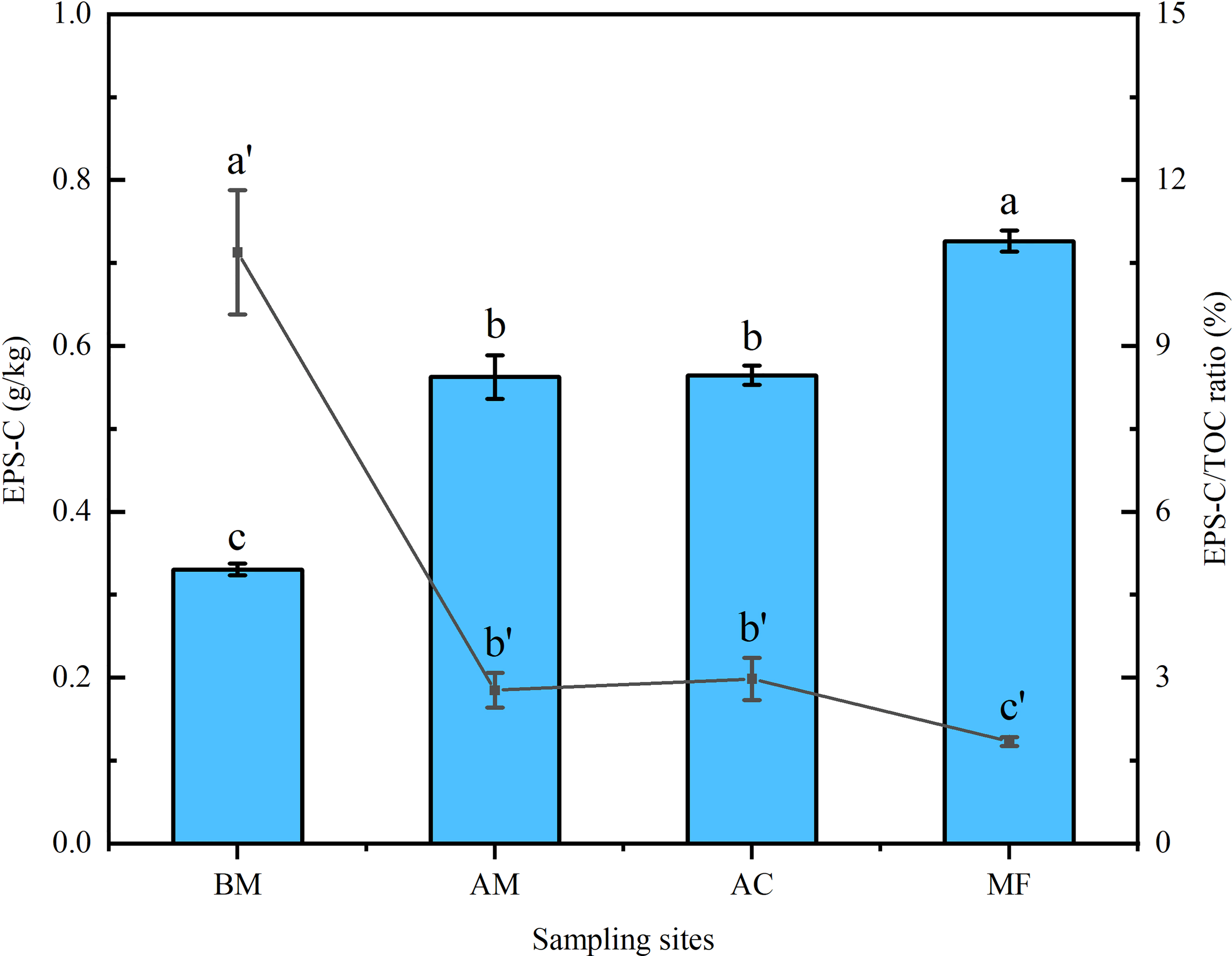 Variation in EPS-C content and EPS-C/TOC ratio in sediments associated with four sampling sites. The bar chart (relevant to the left Y-axis) and line graph (relevant to the right Y-axis) represent the values of EPS-C and the EPS-C/TOC ratio, respectively. Mean ± SE, different letters show significant differences (p < 0.05) among the four different sampling sites.