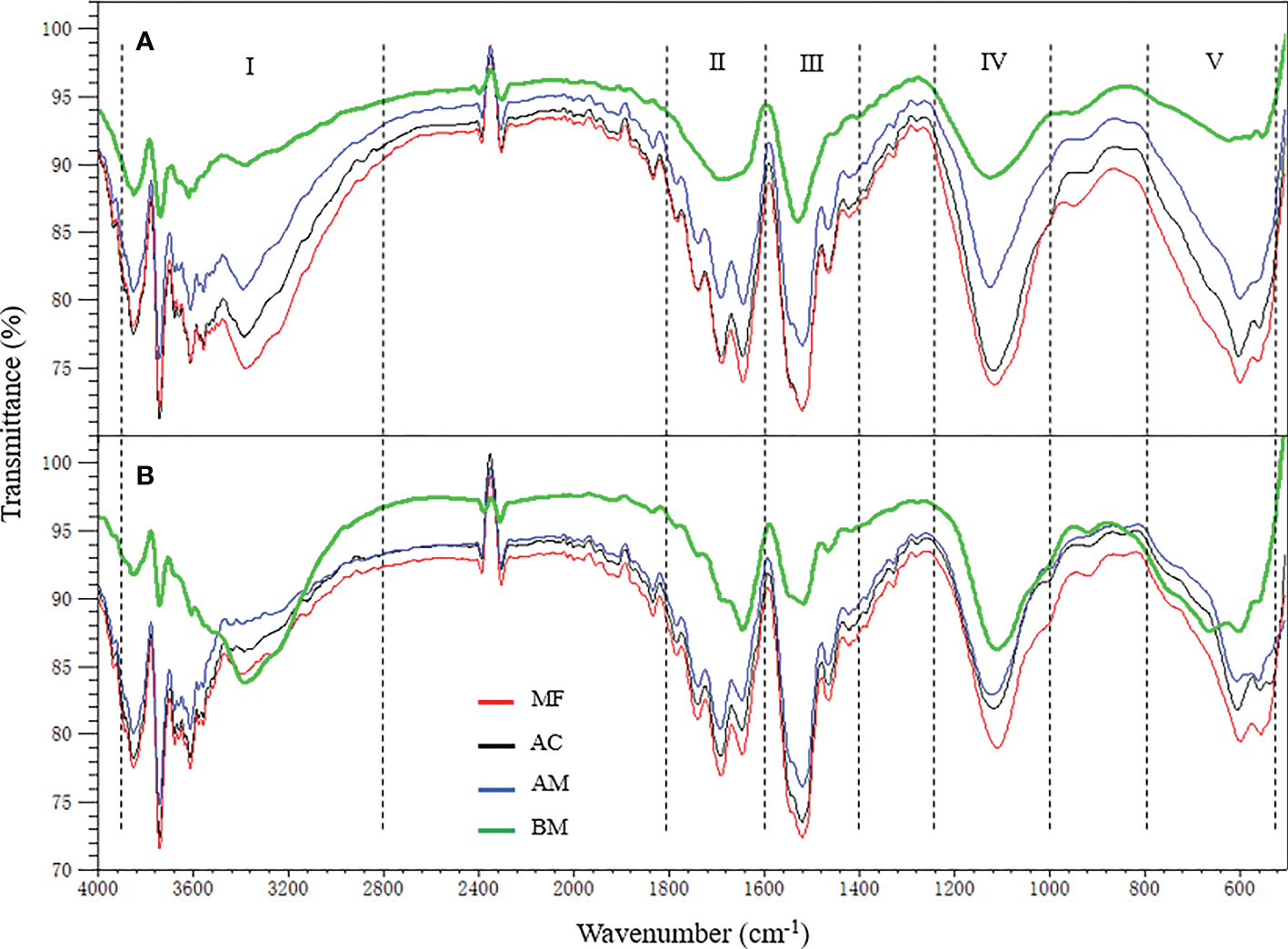 Similar infrared bands of EPS were observed, regardless of colloidal or bound subfraction. The results from Figure 3 show five dominant peak segments: 3520-3200 cm-1 in region I (O-H stretching associated with oxhydryl), 1800-1600 cm-1 in region II (C=C, C=O stretching, C=N, N-H vibrations from proteins), 1600-1400 cm-1 in region III (stretching of O-alkyl group, methyl and methylene which may be attributed to proteins), 1200-1000 cm-1 in region IV (ring vibrations of P=O, P-O, C-O-C, C-O-P partially attributed to polysaccharides) and 650-400 cm-1 in region V (region without functional groups, stretching of C-H). In terms of the difference in FTIR transmittance intensity among EPS extracted from the four sampling sites, the highest transmittance intensity for all infrared bands was consistently exhibited in MF, followed by AC, AM, and BM.