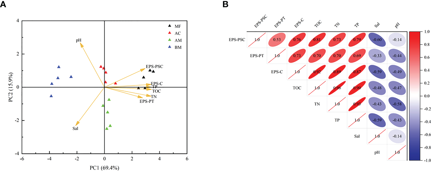 Principal component analysis and Pearson’s correlation analysis of sediment physicochemical properties (KMO value = 0.690; n = 20). (A): Triangle scatters in different colors represent the four sampling sites. (B): Positive correlations are identified in red, while negative correlations are identified in blue.
