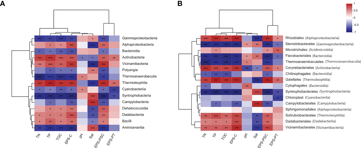 Two-matrix heatmap analyses for the relationships between sediment parameters and the bacterial community. (A): correlation analysis of the bacterial community at the class level; (B): correlation analysis of the bacterial community at the order level. Red indicates positive correlations, while blue indicates negative correlations. Meaning of asterisks, *p < 0.05; **p < 0.01; ***p < 0.001.