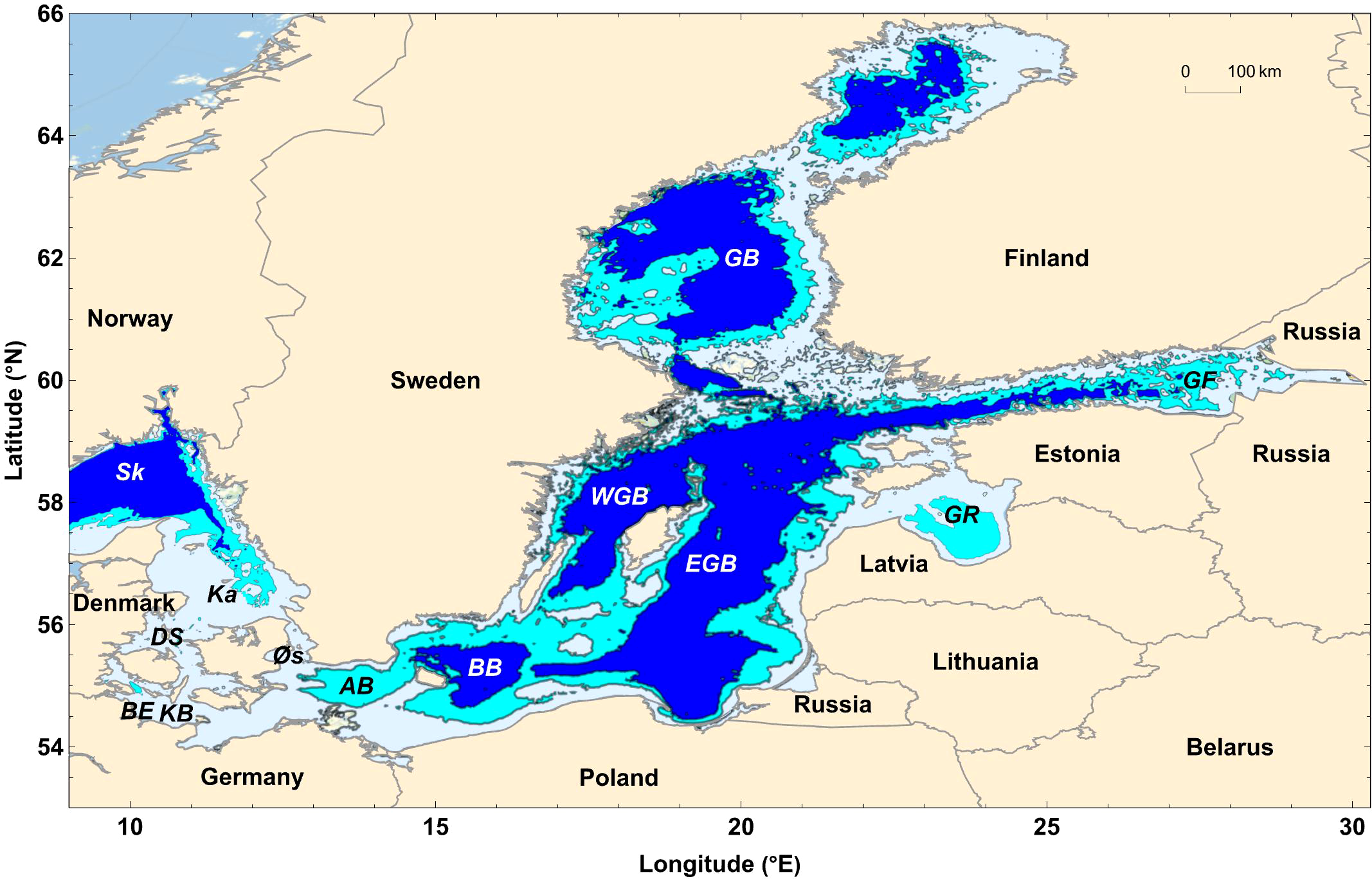 Figure 1 Map of the Baltic Sea and bordering countries. The map includes the Skagerrak (Sk), Kattegat (Ka), Danish straits (DS), Øresund (Øs), Kiel Bight (KB), Boknis Eck (BE), Arkona Basin (AB), Bornholm Basin (BB), Western Gotland Basin (WGB), Eastern Gotland Basin (EGB), Gulf of Riga (GR), Gulf of Finland (GF), and Gulf of Bothnia (GB). Colors indicate water depths (blue: > 65 m, cyan: 65 – 30 m, light blue: 0 – 30 m). The map was produced using Mathematica 13.