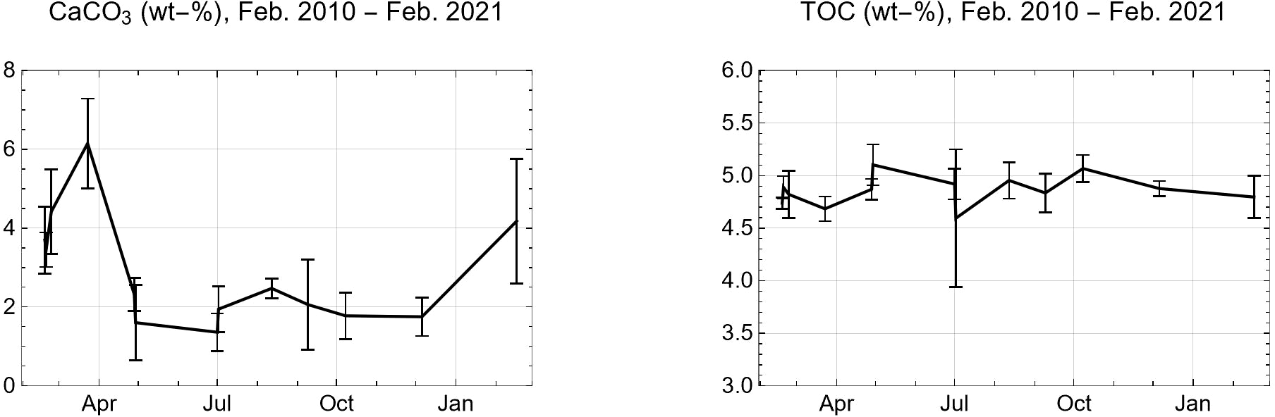 Figure 4 Mean concentrations of CaCO3 and total organic carbon (TOC) in surface sediments (0 – 5 cm sediment depth) taken in Boknis Eck from Feb. 2010 to Feb. 2011 (Dale et al., 2013). Error bars indicate one standard deviation from the mean.