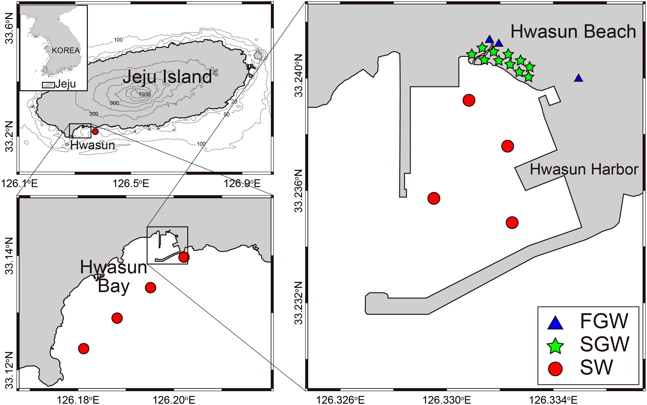Maps showing study area and sampling stations for fresh groundwater (FGW), saline groundwater (SGW), and coastal seawater (SW). Modified from Kim et al. (2022).