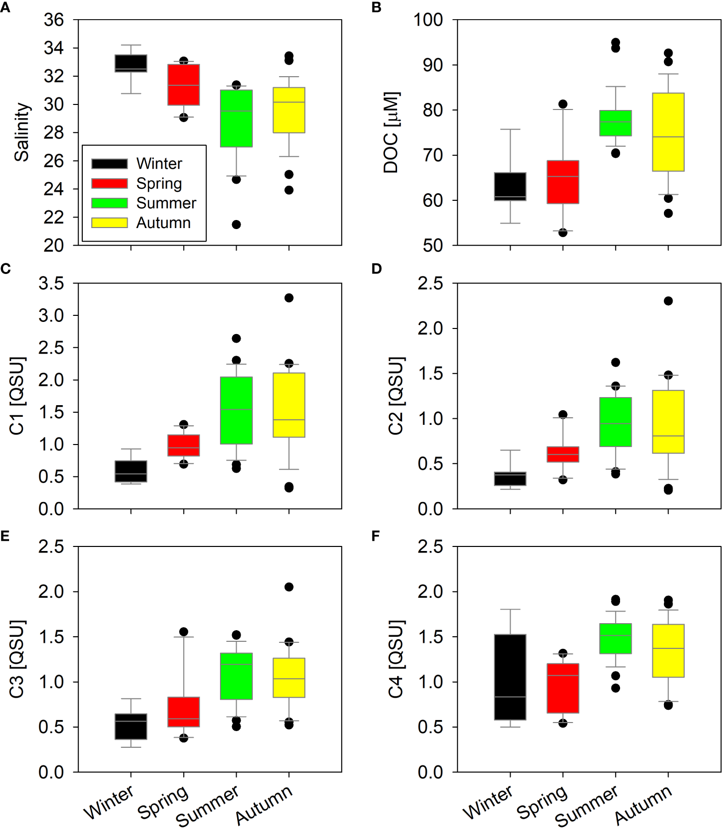 Comparison of salinity (A), DOC (B), and FDOM components (C–F) in the coastal seawater during different seasons.