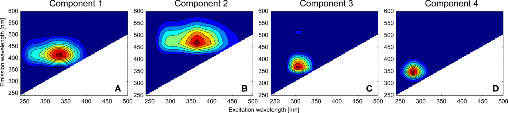 Excitation–emission matrix spectroscopy contour plots of four components [C1 (A), C2 (B), C3 (C), and C4 (D)] determined by the parallel factor analysis model.