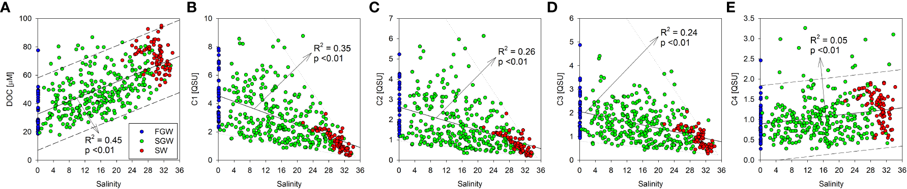 Scatterplots of the DOC and the FDOM components (C1–C4) against salinity in the FGW, SGW, and SW. The solid lines (A–E) and the dashed lines (A, E) indicate the regression lines and the prediction intervals of the scatterplots, respectively. The dotted lines indicate the upper and lower limit of the relationship between FDOMH and salinity (B–D).