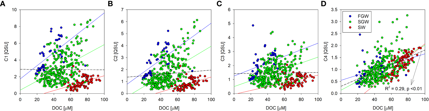 Scatterplots between the DOC concentration and the fluorescent intensities for the FDOM components (C1 (A), C2 (B), C3 (C), and C4 (D)) in the FGW, SGW, and SW. The blue, green, and red colored lines indicate the regression lines of the FGW, SGW, and SW, respectively. The dashed lines in black indicate the regression lines of the entire data.