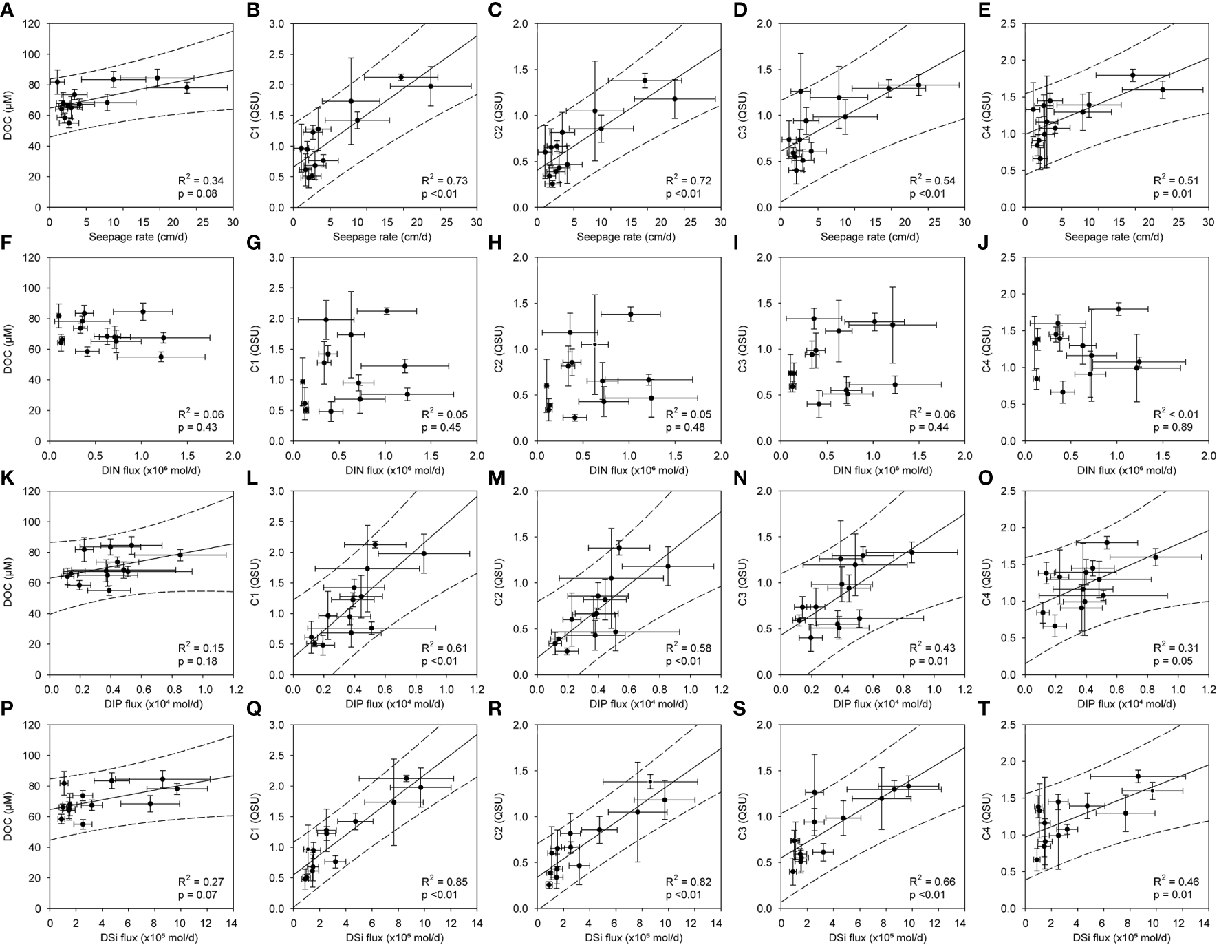 Scatterplots of the DOC concentration and the fluorescent intensities of the FDOM components (C1–C4) against the seepage rate (A–E) and the flux of inorganic nutrients (nitrate (F–J), phosphate (K–O), and silicate (P–T)). The solid and dashed lines indicate the regression lines and the prediction intervals of the scatterplots, respectively.