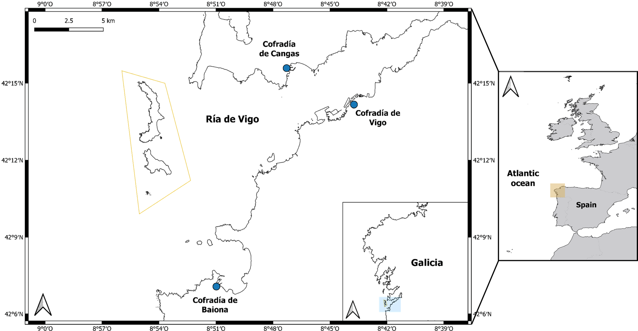 The study was carried out in NW Spain along the Galician Ría de Vigo fishing zone and its area of influence, which includes the Cíes Archipelago belonging to the IANP (Figure 1). In this fishing area, 16 cofradías concentrate approximately 573 small-scale fishing boats, but not all of them fish on kelp areas. For this reason, we focused our study on three of them: Cofradía de Vigo, Cofradía de Cangas, and Cofradía de Baiona, with 227 small-scale fishing boats.
