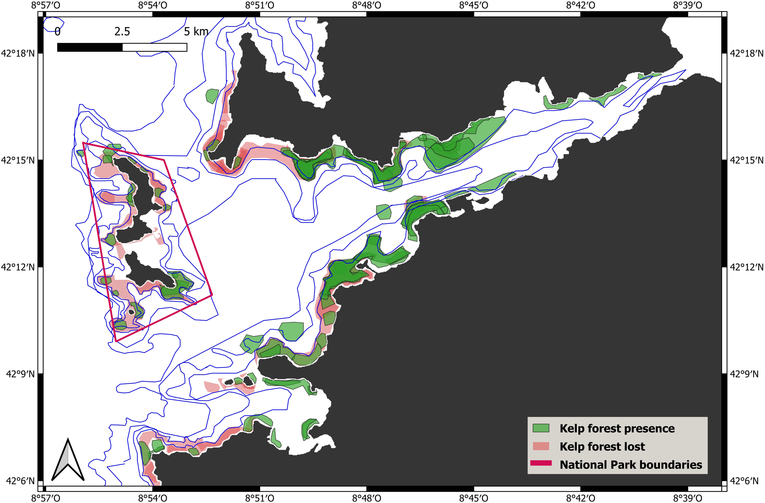 Kelp forest distribution in the study area inferred from local ecological knowledge. The map integrates the information provided by local small-scale fishers on the current (kelp forest present) and historical (kelp forest lost) occurrence of kelp forest areas in Ría de Vigo.