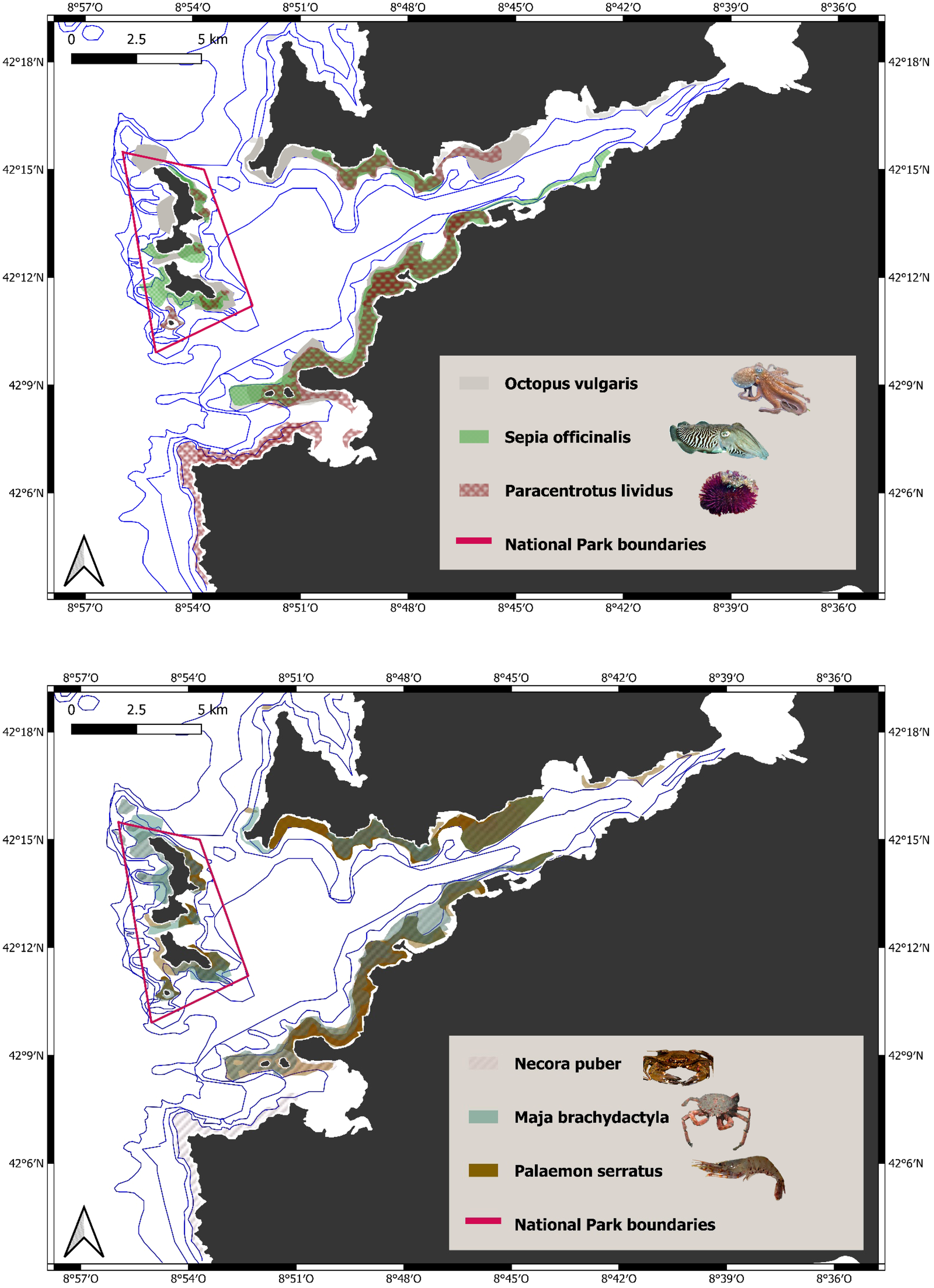 Our results indicate that kelp forest areas are under high fishing pressure throughout the year. All of the small-scale fishers who were interviewed carry out their activity in Ría de Vigo and the IANP, although the particular places where they do most of their fishing depend on which cofradía they belong to (Supplementary Material Figure S3). Most fishers always fish in the same areas, regardless of the target species, and only change the fishing gear they use at any given time. They employ a range of nets (purse seines, gillnets, and trammel nets) and pots and hook-and-line gear (longlines, drifting longlines). Nets are mainly used for some fishes (e.g., Mullus surmuletus, Diplodus sargus, L. bergylta) and spider crab M. brachydactyla, while hook-and-line gear is used for fishes such as D. labrax and P. pollachius. On the other hand, pots are used to fish all crustaceans (e.g., N. puber, H. gammarus, Palaemon serratus), some fishes (Trisopterus luscus, Conger conger), and some mollusks (O. vulgaris, Sepia officinalis). Seaweeds, the sea urchin P. lividus, and the mollusk Haliotis tuberculata are fished by hookah diving.