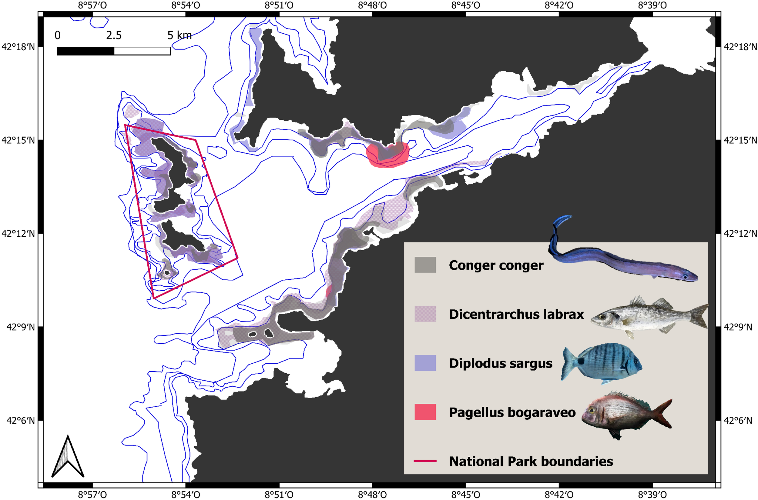 Fishing areas of finfish commercial species with higher economic value in Ría de Vigo inferred from fishers who were interviewed.