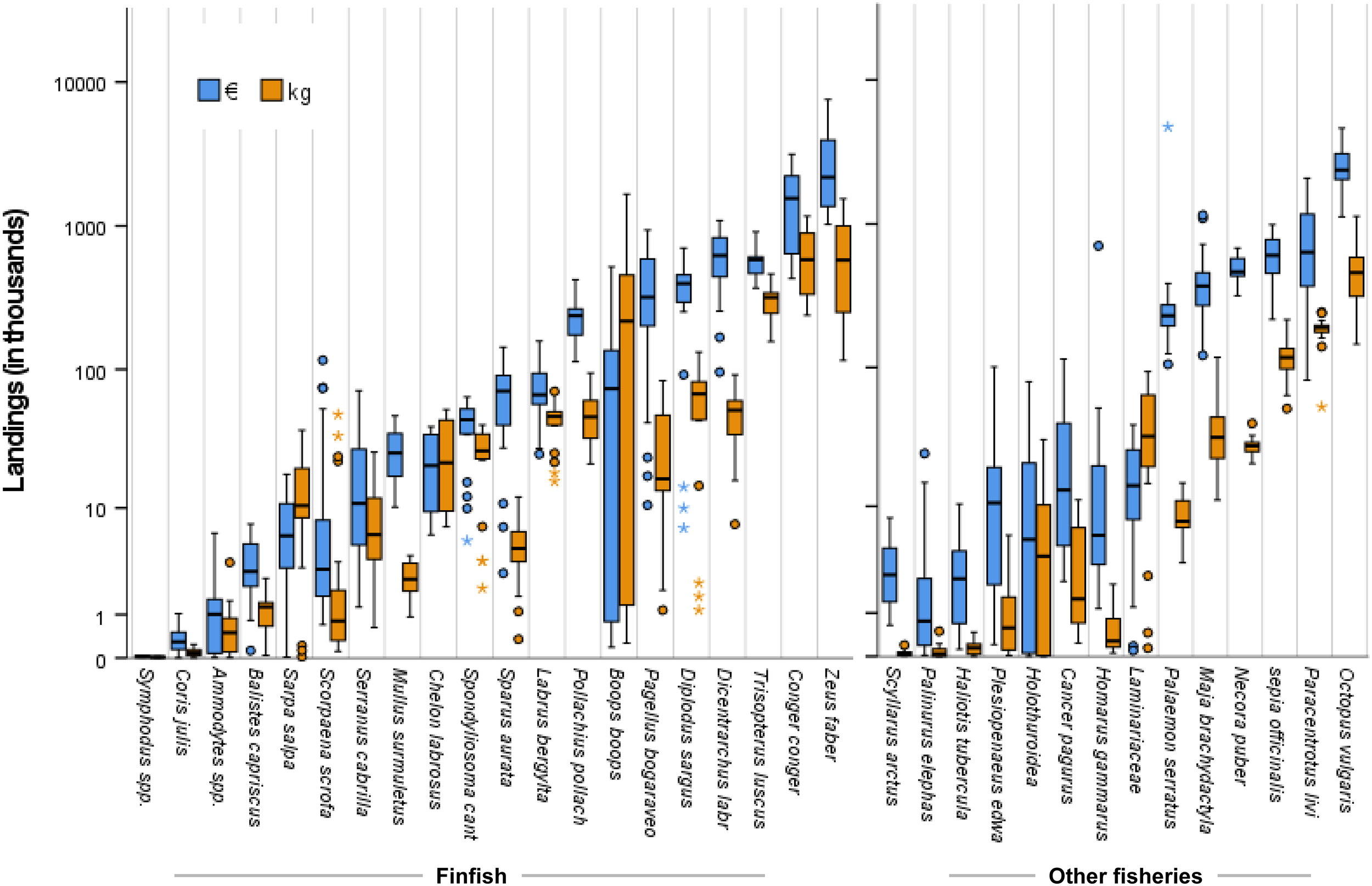 Landings data (2001–2021) in euros and kilograms for fisheries typically linked to kelp forest areas in NW Spain. From bottom to top, boxplots show minimum, first quartile, median, third quartile, and maximum. Outside (>1.5 times the interquartile range above or below the box) and far outside (>3 times the interquartile range) values are displayed as dots and asterisks, respectively.