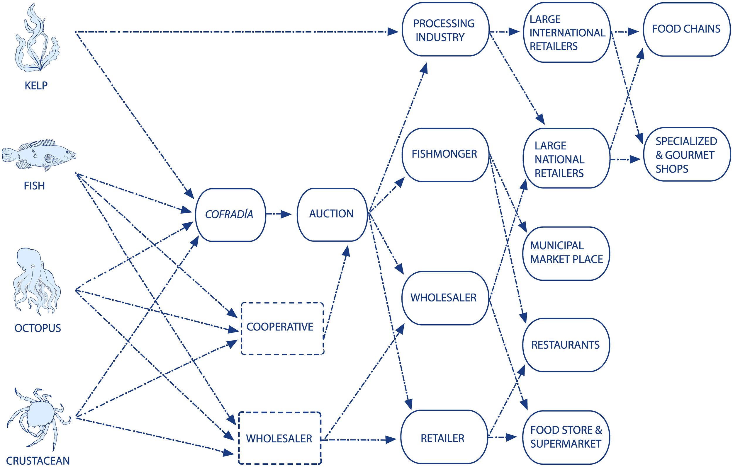 In NW Spain, kelp forests host a diversity of faunal groups with commercial value in the region, such as fishes (e.g., Labrus bergylta, Dicentrarchus labrax, and Pollachius pollachius), crustaceans (e.g., Maja brachydactyla), mollusks (e.g., Octopus vulgaris), and echinoderms (Paracentrotus lividus) (Pita et al., 2018, Pita and Freire, 2019, Fernández et al., 2020). Many of these species move millions of euros (€) annually (Pita et al., 2016, Piñeiro-Corbeira et al., 2022) in the region. Fishing in this region is mainly characterized as small-scale fisheries (SSFs), where the fishing activity plays a vital role in providing employment and sustainable livelihoods for people and maintaining cultural heritage (Pascual-Fernández et al., 2020a). Here, SSF fishing activities are conducted nearshore, many of them on rocky reefs dominated by kelp forests (Guyader et al., 2013, Piñeiro-Corbeira et al., 2022). In fact, Galicia concentrates 57.37% of the Spanish small-scale fleet, being one of the regions with the highest socioeconomic dependence on fishing in the European Union (EU) (Villasante et al., 2015). Fishing landings are sold fresh in the fish markets of each zone at daily auctions (Surís-Regueiro and Santiago, 2014). Many of the fish auctions are managed by cofradías (fisher organizations) (Bavinck et al., 2015, Pascual-Fernández et al., 2020b). After that, marine products are distributed, thanks to large fish processors, local fish merchants, and retail traders, until they reach the local marketplace and supermarkets and restaurateurs. Seaweeds themselves also have a relevant economic value, being the kelp-harvesting sector that has grown in recent decades (Piñeiro-Corbeira et al., 2022). In fact, in Galicia, four species are harvested, processed, and distributed by national and international retailers.