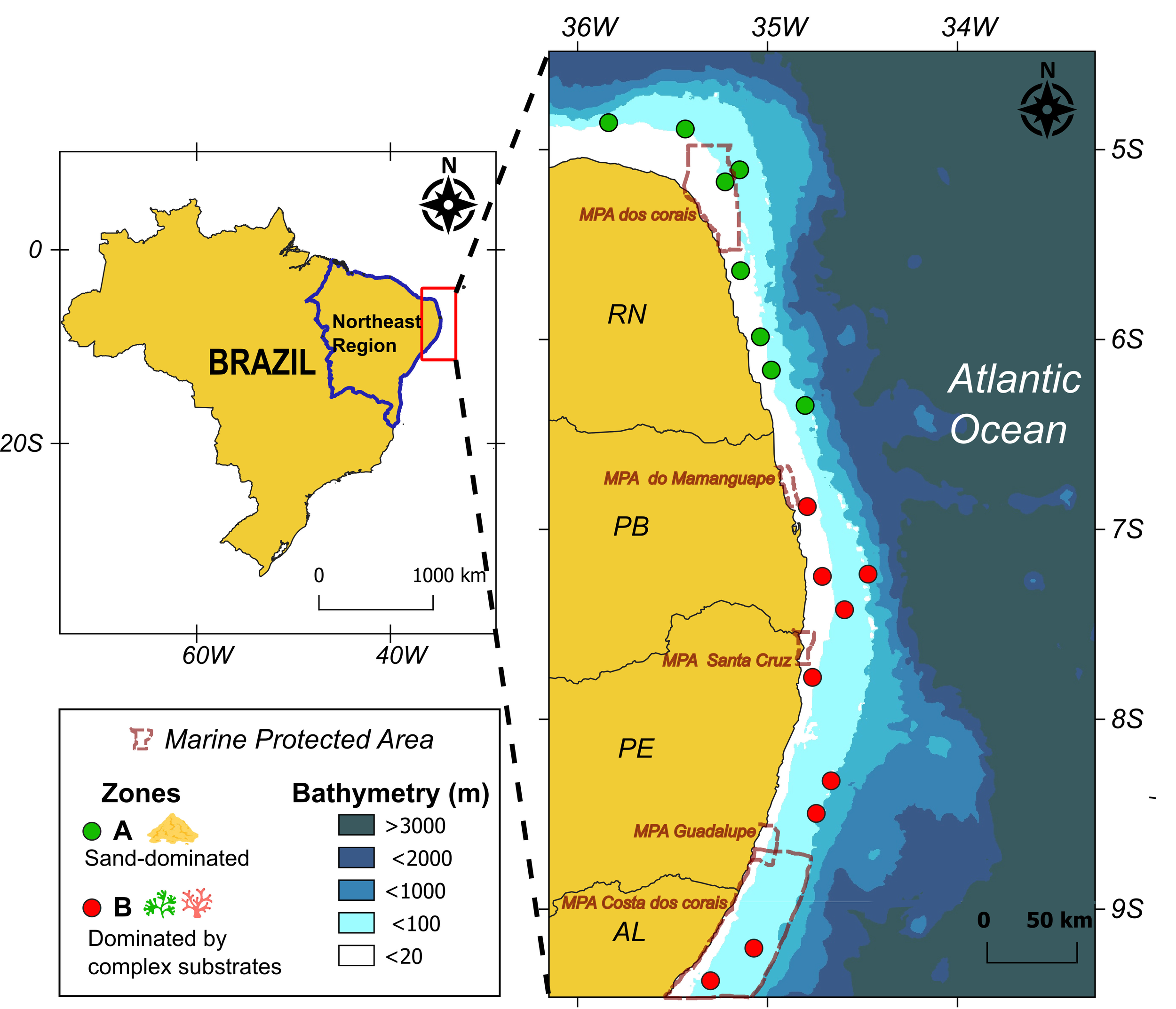 Study area with sampling points in northeastern Brazil, in two contrasting zones: one dominated by sand (green dots) and another with more complex substrates such as algae and coral reefs (red dots).AL, Alagoas; PB, Paraiba; PE, Pernambuco; RN, Rio Grande do Norte.