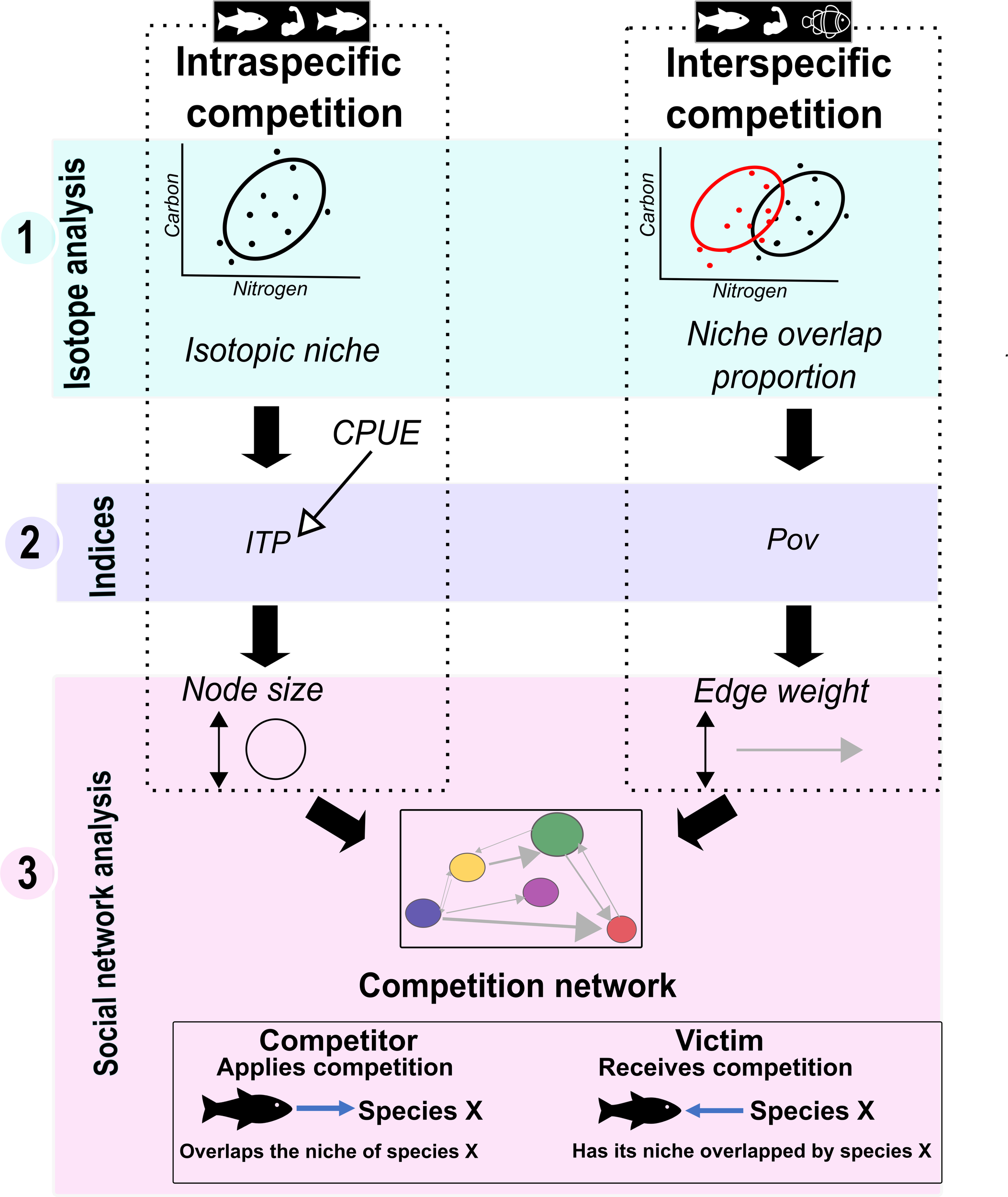Demersal fish competition in both zones was investigated using the following three steps (Figure 2) (1): Stable isotope analysis (2), Calculation of interspecific and intraspecific competition indices, and (3) Social network analysis.