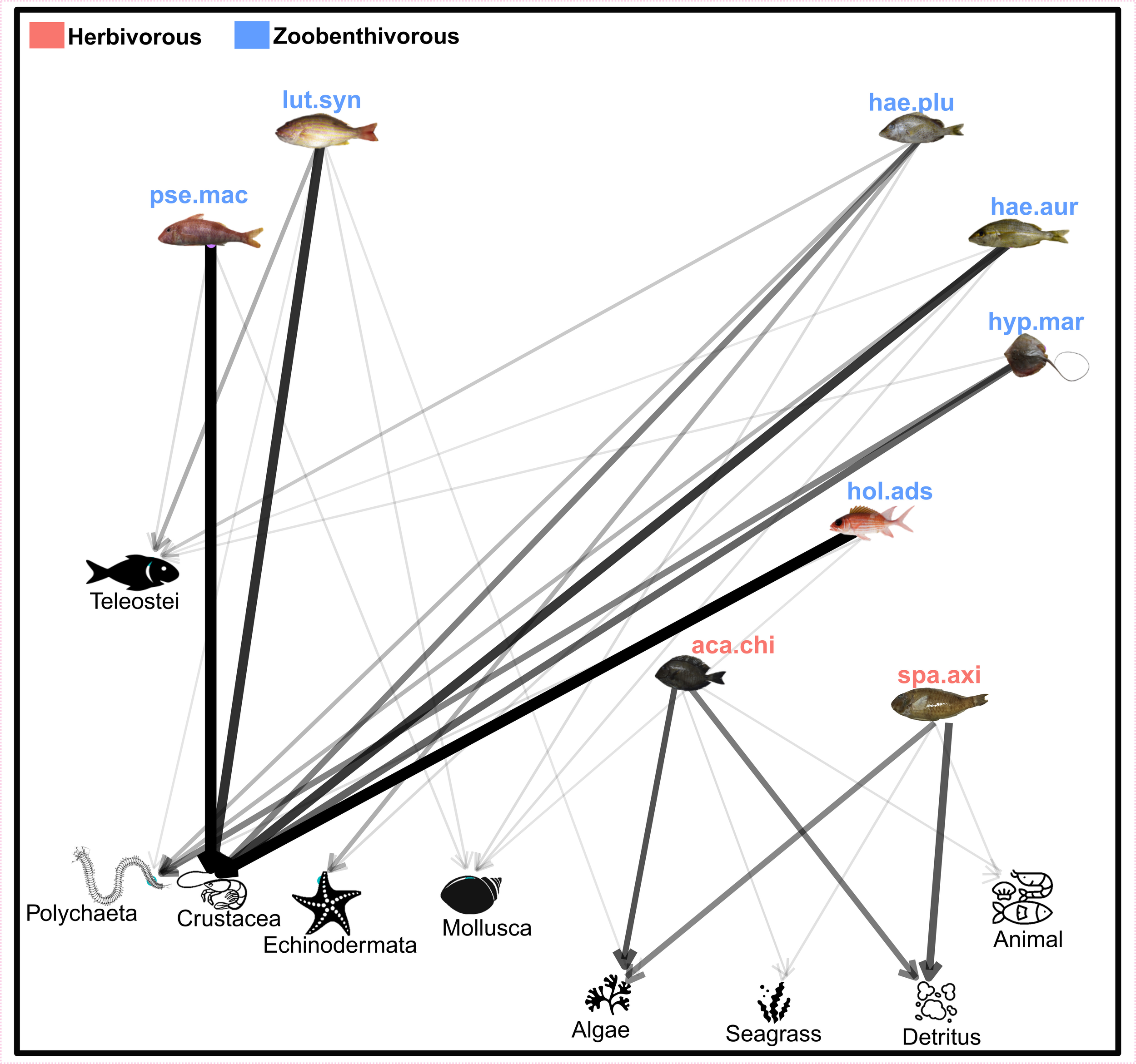 Network representing the main trophic compartments from which each selected species feeds. The thickness of the arrows corresponds to the importance of each item in the diet. lut.syn, Lutjanus synagris; pse.mac, Pseudopenneus maculatus; hae.plu, Haemulon plumierii; hae.aur, Haemulon aurolineatum; hyp.mar, Hypanus marianae; hol.ads, Holocentrus adscencionis; aca.chi, Acanthurus chirurgus; spa.axi, Sparisoma axillare.