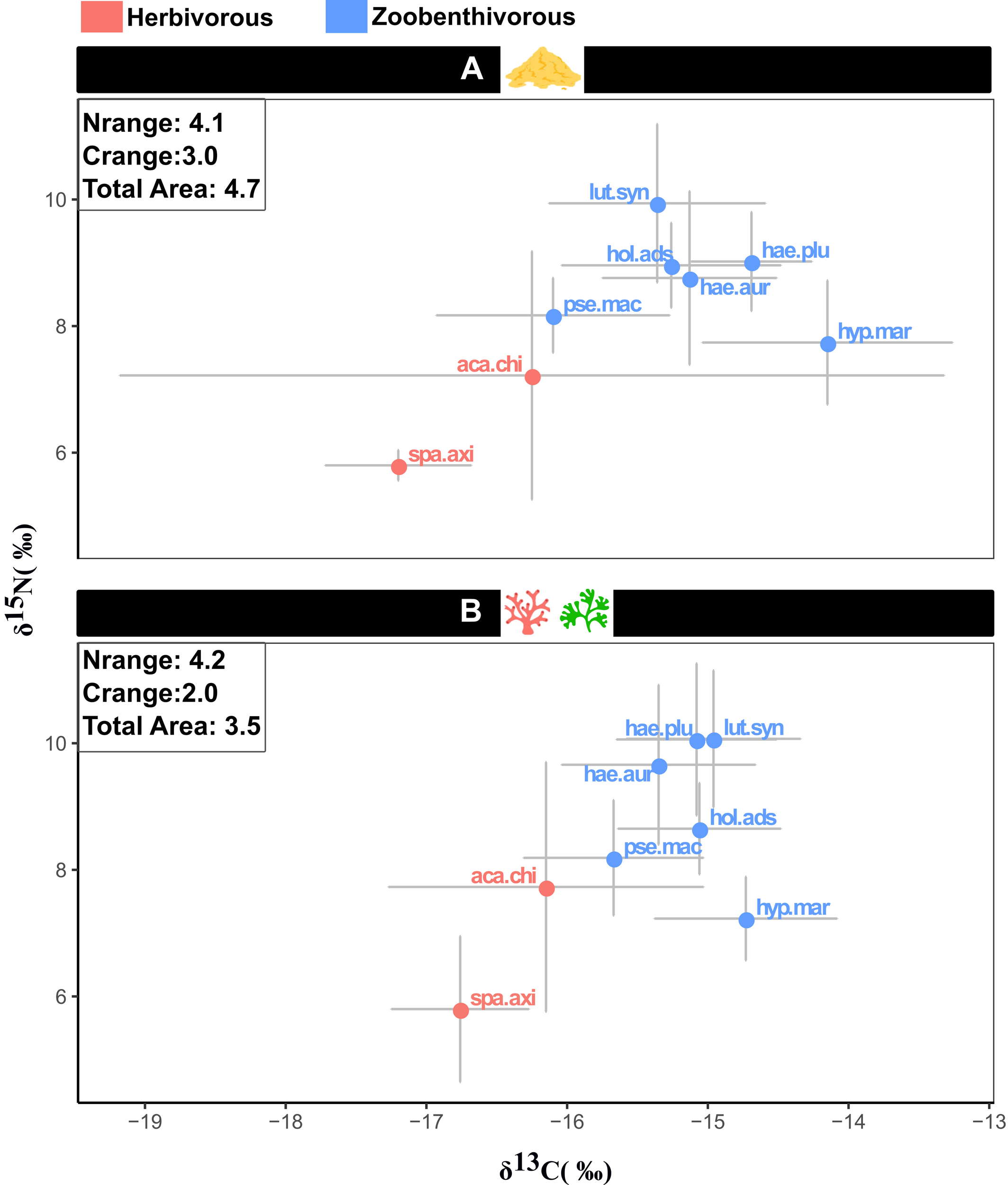 Biplot showing the mean and standard deviation of carbon and nitrogen isotopic compositions of the eight selected species in zones (A) (sand-dominated) and (B) (complex substrates). The fish community’s nitrogen/carbon range and total isotopic area in each zone are shown on the biplots. lut.syn, Lutjanus synagris; pse.mac, Pseudopenneus maculatus; hae.plu, Haemulon plumierii; hae.aur, Haemulon aurolineatum; hyp.mar, Hypanus marianae; hol.ads, Holocentrus adscencionis; aca.chi, Acanthurus chirurgus; spa.axi:, Sparisoma axillare.