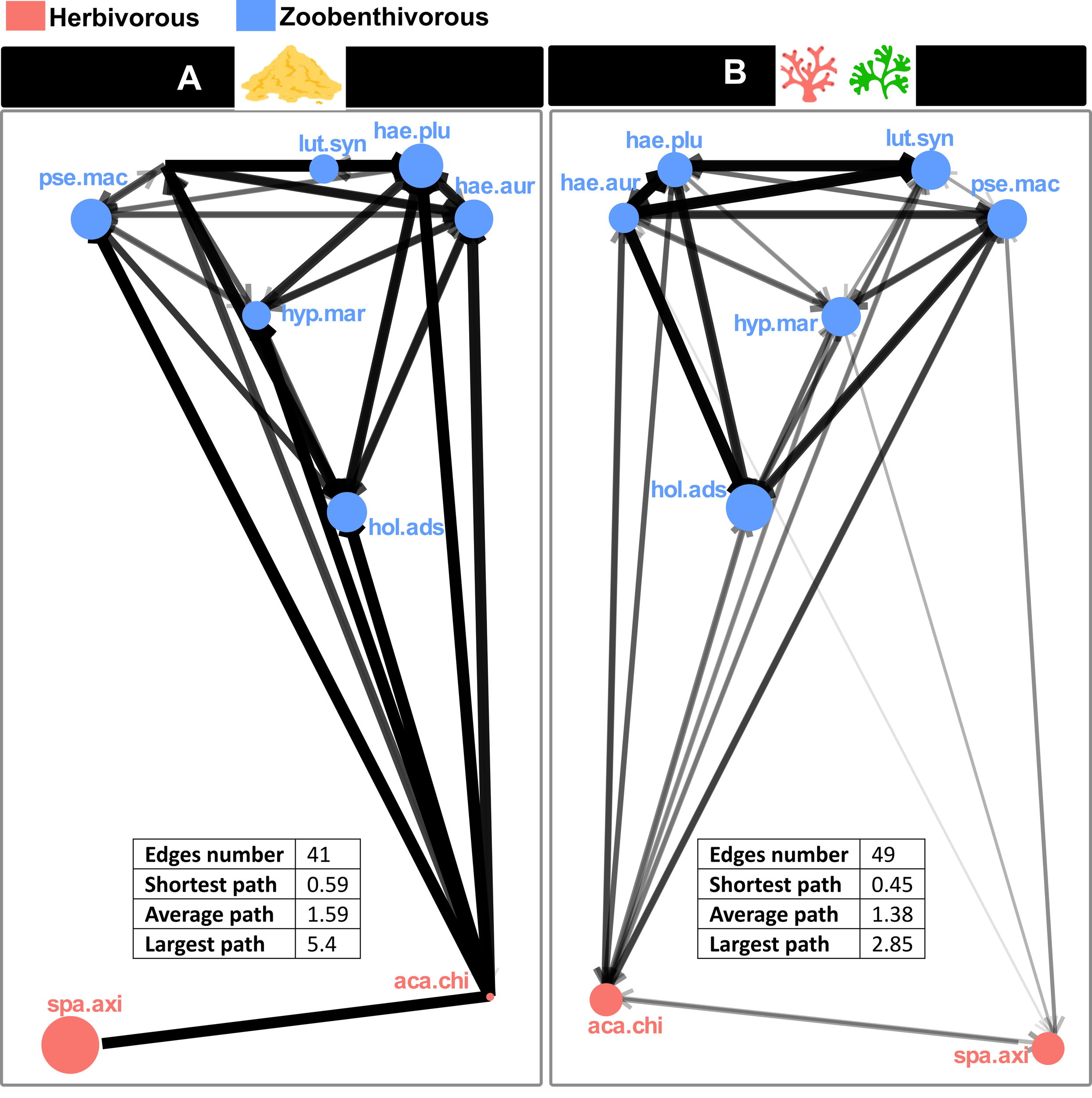 Acanthurus chirurgus presented a vast carbon range, especially in zone A. Moreover, in both zones, this herbivorous species had an extensive nitrogen range that overlapped with the δ15N values of zoobenthivorous fish. The other herbivore, S. axillare, showed a much smaller carbon range in both zones, lower nitrogen values, and a smaller nitrogen range. In zone A, L. synagris exhibited the highest nitrogen values allowing its isotopic niche to be little overlapped by other species. On the other hand, in zone B, its δ15N values were not significantly different from those of the haemulids. In both zones, H. marianae had higher δ13C and lower δ15N values than other zoobenthivores.Both zones exhibited differences in the structure of their competition networks (Figure 5). In zone A, there were fewer interactions (number of edges), but the intensity of the interactions was higher than in zone B. The shortest, largest, and average paths were higher in the sand-dominated zone A.