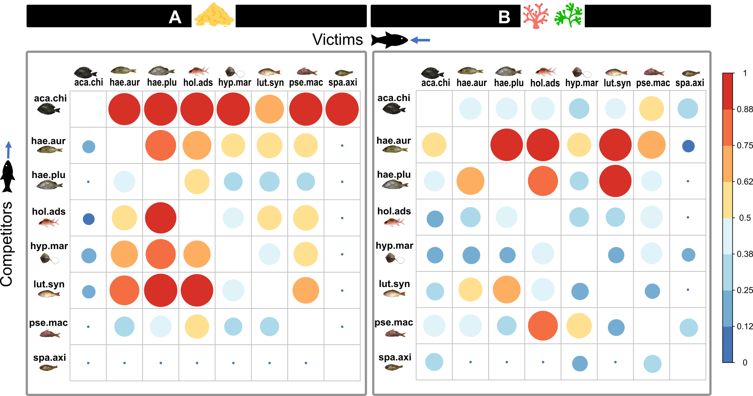 Matrix representing the intensity of the interspecific competition between each species pair in zones (A) (sand-dominated) and (B) (complex substrates). The colour and the size represent the proportion of the victim’s niche (column) overlapped by the competitor (row). lut.syn, Lutjanus synagris; pse.mac, Pseudopenneus maculatus; hae.plu, Haemulon plumierii; hae.aur, Haemulon aurolineatum; hyp.mar, Hypanus marianae; hol.ads, Holocentrus adscencionis; aca.chi, Acanthurus chirurgus; spa.axi, Sparisoma axillare.