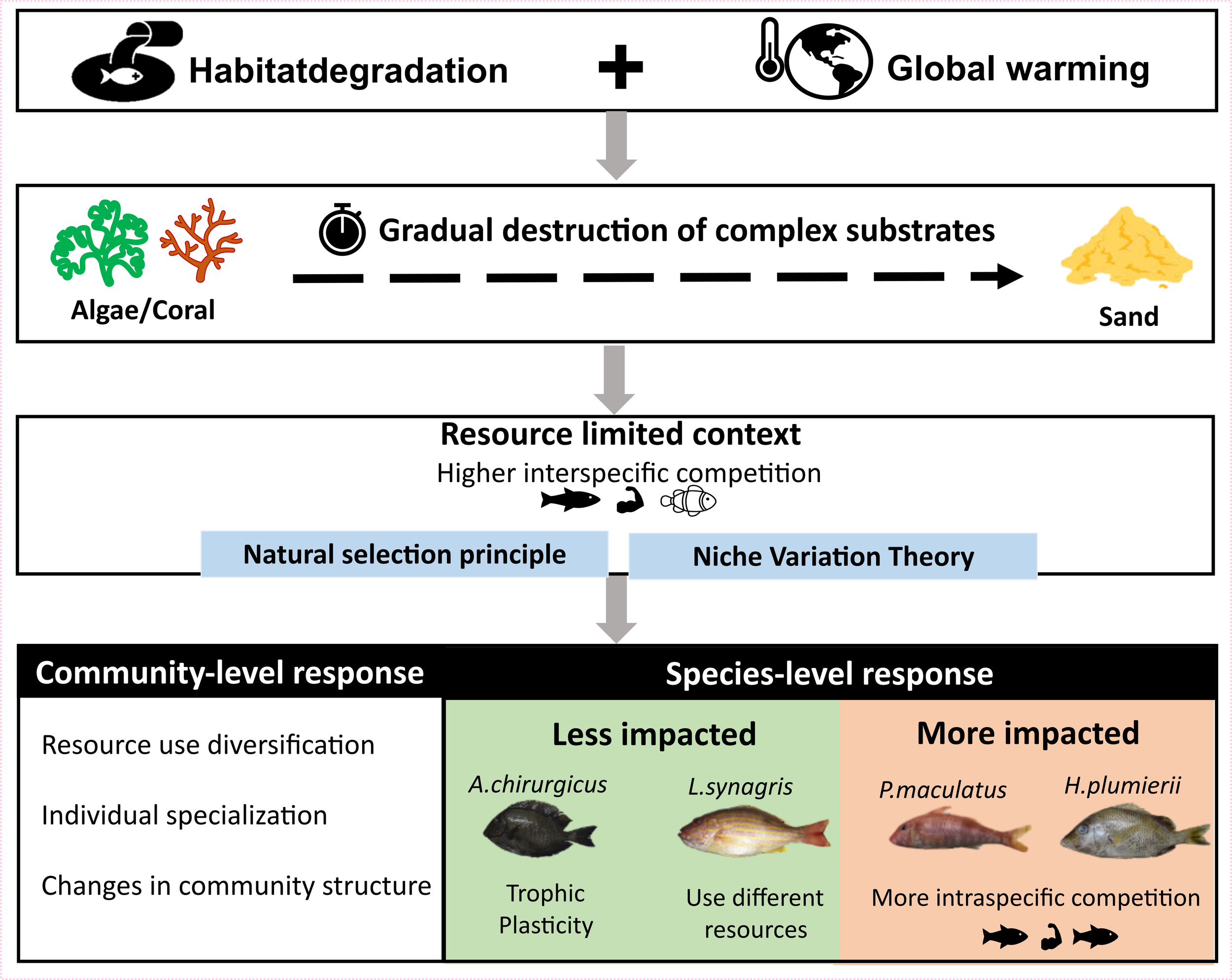 This study potentially gives a perspective on the future ecological response at the community and species level of the demersal fishes (Figure 7). With habitat degradation and climate change (Hall-Spencer and Harvey, 2019), the complex substrates in zone B will probably disappear gradually, transforming this zone into an ecosystem akin to zone A. This would lead to a resource-limited context exacerbating competition between species and inducing the resource use diversification shown in our results. According to the principle of natural selection, the intensity of competition should decrease over time among sympatric populations due to species adaptive changes (Darwin, 1859). Some species like A. chirurgus and L. synagris will adapt because of their trophic plasticity or ability to use different resources. Conversely, species like P. maculatus and H. plumierii might suffer from competitive exclusion because they will invest in intraspecific competition (niche width reduction) to cope with the interspecific competition. As these species are of socio-economic importance (De Melo et al., 2020; Soares et al., 2020), fisheries could suffer from this natural selection due to the disappearance of complex substrates.