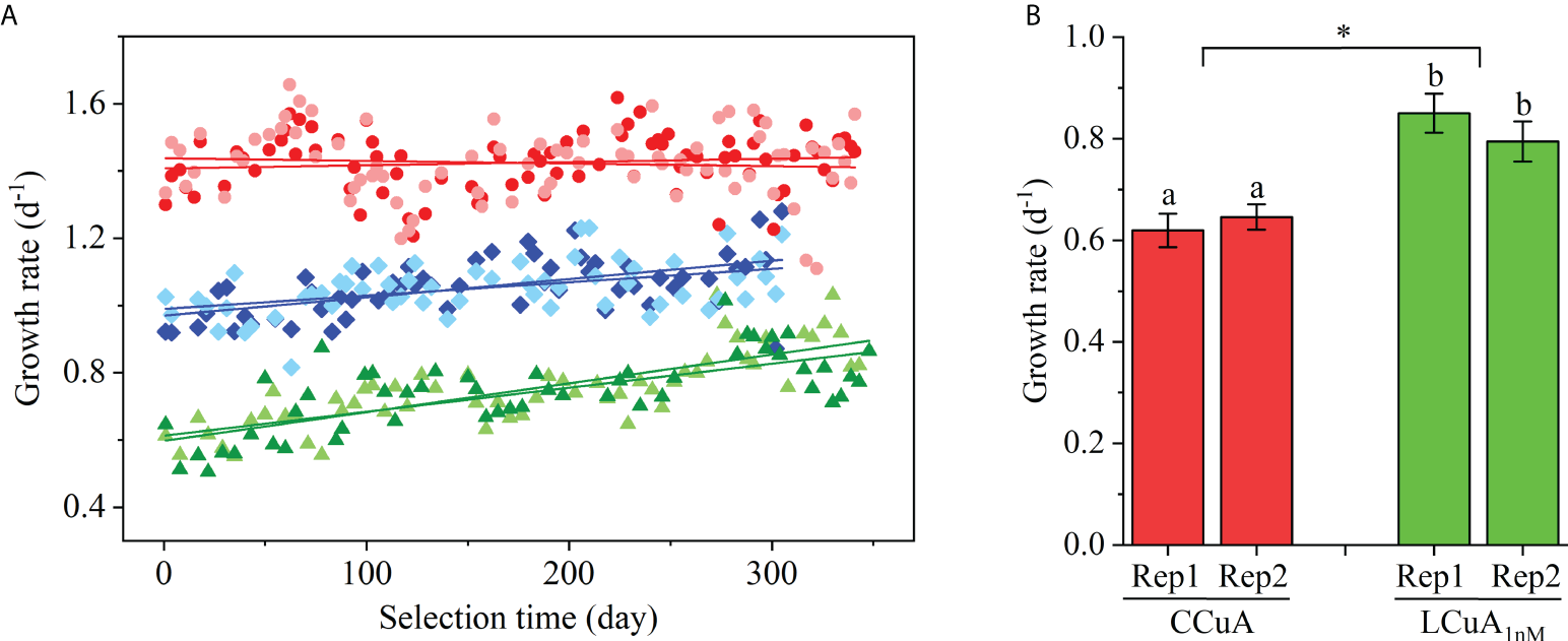 In short-term assay experiments, T. oceanica achieved maximum growth rate in Cu-sufficient medium (Kong and Price, 2019), ultimately limited by temperature. The increase in rate of the CCuA population (~15%) was likely a result of continuous selection for fast-growing phenotypes by the culturing method. The ancestral population used to derive the CCuA and LCuA1nM populations was originally maintained in batch culture and transferred approximately every two weeks when the cells reached stationary phase. In this method, cells grew exponentially when resources were initially plentiful and then entered stationary phase as a result of resource depletion. Transition from exponential to stationary growth would thus impose temporally varying selection for fast growing and survival phenotypes in the population. Transferring the CCuA and LCuA1nM populations prior to stationary phase eliminated selection for the survival phenotypes and enriched fast-growing phenotypes in the population. The plateauing of growth rate after 973 days (Figure 2; Supplementary Figure S1), implied that the CCuA population reached the maximum set by the environmental conditions of the experiment.