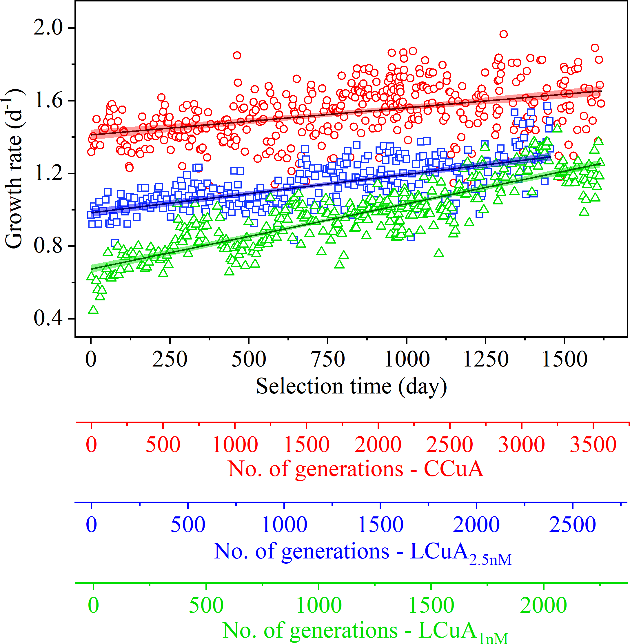 Specific growth rate (d-1) of T. oceanica as a function of selection time in Cu-sufficient (○) and Cu-deficient medium containing 2.5 nM (◻) or 1 nM (△) Cu. The number of cell generations corresponding to the selection time is reported for the control (CCuA) and low Cu-adapted (LCuA2.5nM, LCuA1nM) populations. Each data point represents the specific growth rate of one batch culture. Solid lines are the least squares linear regressions of growth rate as a function of selection time for each population. Color bands surrounding the regression lines represent the 95% confidence interval.