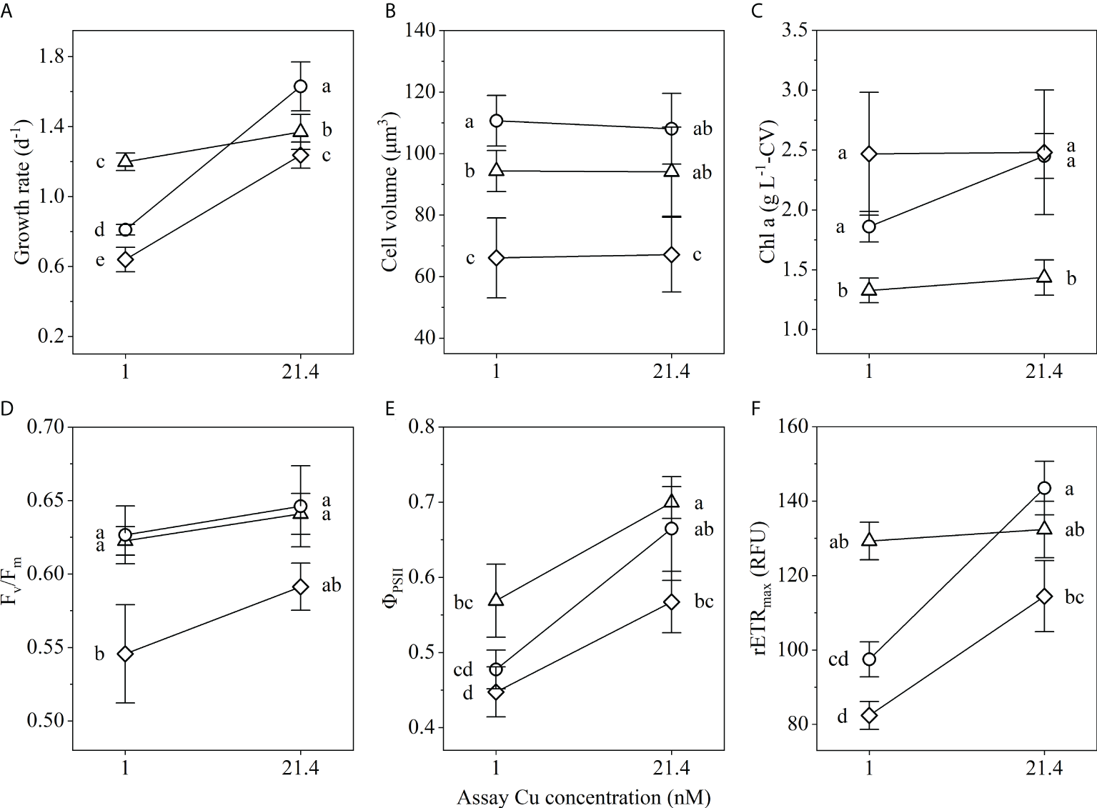 Physiological traits of LCuA1nM (△), CCuA (○) and ancestral (♢) populations in Cu-deficient and Cu-sufficient medium: (A) specific growth rate, (B) cell volume, (C) cell volume-normalized chlorophyll a, (D) maximum quantum yield of photosystem II (Fv/Fm), (E) effective quantum yield of photosystem II (ΦPSII) and (F) maximum relative electron transport rate (rETRmax). Error bars represent ±1 SD of three to fifteen biological replicates (n=10-15 for A and B; n=3 for C-F). Different lowercase letters indicate a significant difference among traits of the populations (p<0.05, one-way ANOVA).