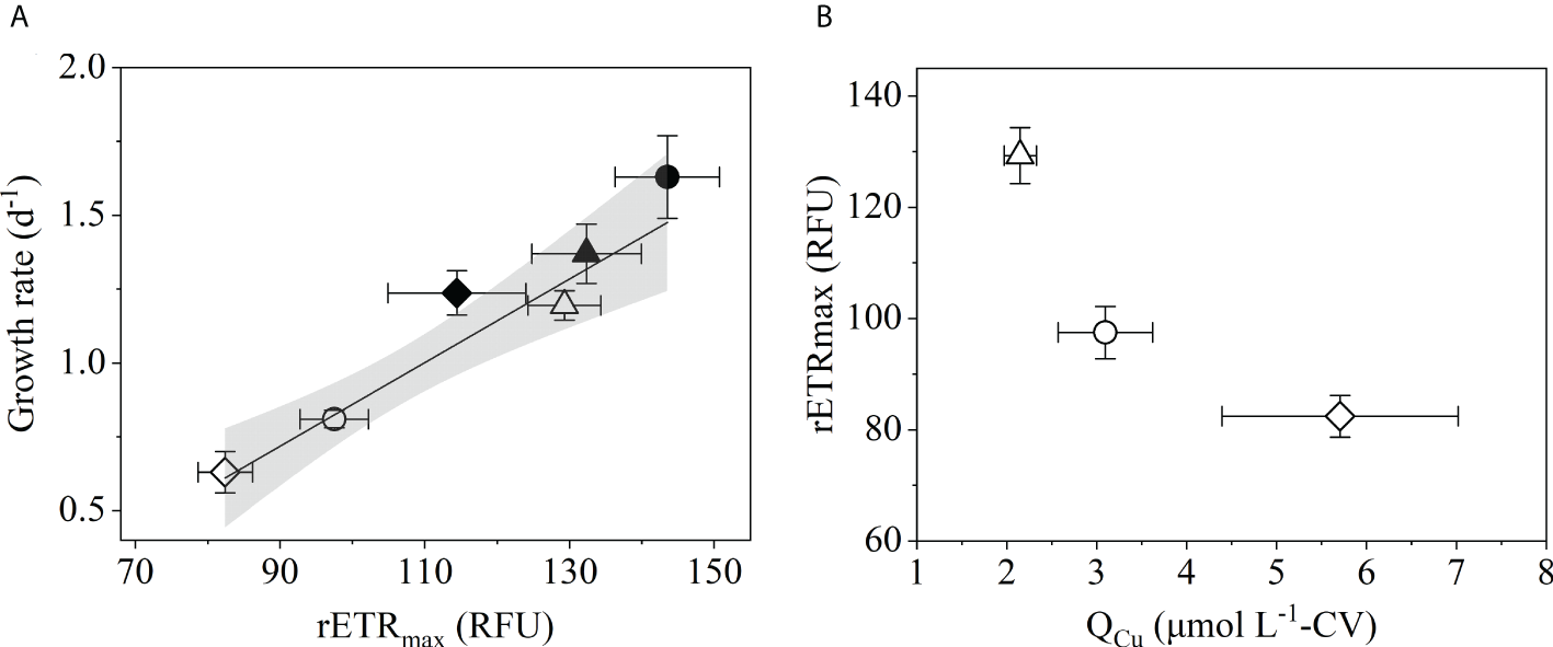 (A) Specific growth rate as a function of maximum relative electron transport rate (rETRmax) of LCuA1nM (◮), CCuA (◑) and ancestral (⬗) populations grown in Cu-deficient (open symbols) and Cu-sufficient (filled symbols) medium. The solid line through the data points is the least squares linear regression (F(1,4) = 47.1, p=0.002) with the grey band indicating the 95% confidence interval. (B) rETRmax as a function of Cu quota (QCu) of LCuA1nM (△), CCuA (○) and ancestral (♢) T. oceanica populations grown in Cu-deficient medium. Error bars represent ± 1 SD of three (rETRmax and QCu) or ten to fifteen (growth rate) biological replicates.