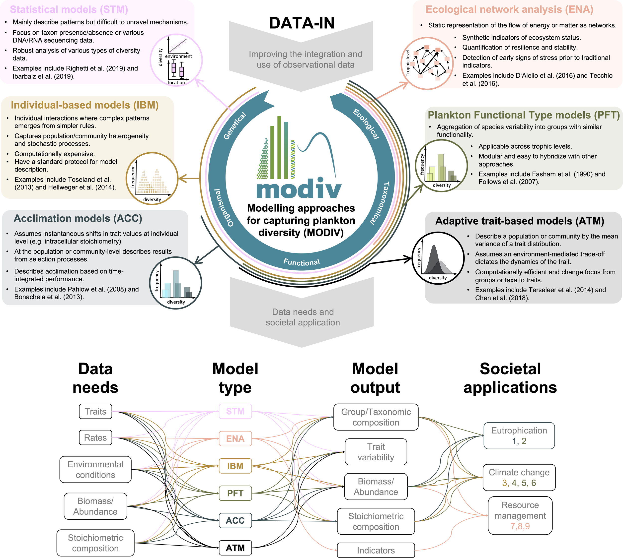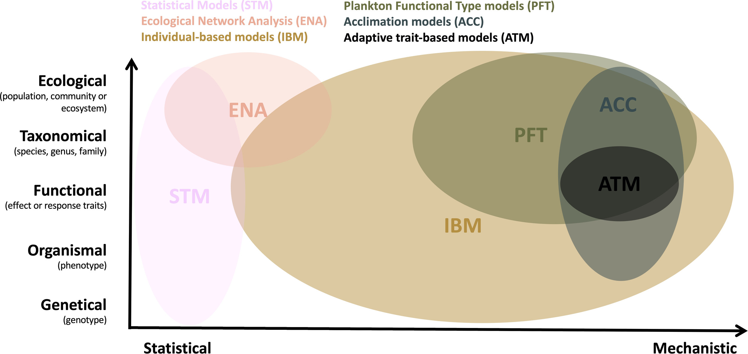 Scientists from different fields of study have developed a wide variety of modelling approaches employed to study plankton biodiversity patterns, with different purposes, in some cases not even focused specifically on biodiversity. We aim to point out the general characteristics and examples of six commonly used approaches, which we categorize as: Statistical (STM), Ecological Network Analysis (ENA), Individual-Based (IBM), Plankton Functional Type (PFT), Acclimation (ACC) and Adaptive Trait-based (ATM) models. These approaches cover the common dimensions of biodiversity, including variability of genotypes, phenotypes, and the composition of communities and ecosystems (vertical axis on Figure 1). We further categorise these six modelling approaches along a “statistical vs. mechanistic” axis (horizontal axis on Figure 1), to better distinguish those models that require explicit descriptions of ecological or biological processes (mechanistic) from those methods that describe mainly empirical relationships based on field, satellite and laboratory observations (statistical).