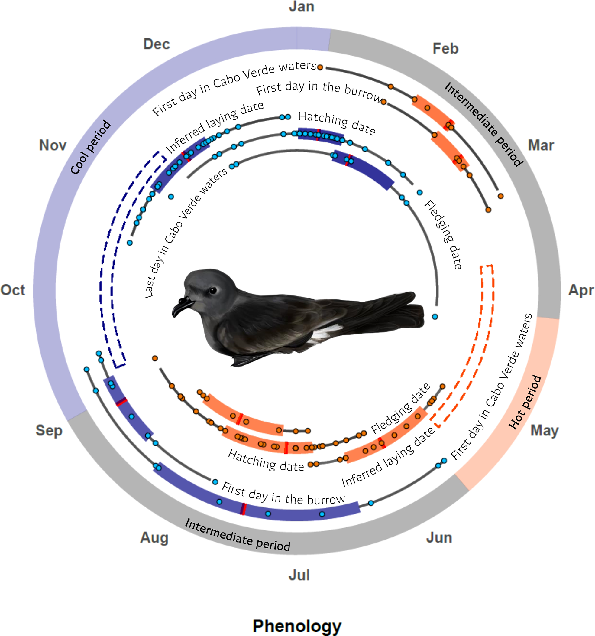 The Cape Verde storm-petrel (Hydrobates jabejabe) is an endemic seabird of the Cabo Verde archipelago (Alexander, 1898; Murphy, 1924; Semedo et al., 2020). It is often considered a year-round breeder, but the occurrence of two breeding peaks, one in summer and one in winter, suggests the existence of two populations. These have been usually referred to as a hot (i.e., summer breeding) and a cool (i.e., winter breeding) population and preliminary evidence indicates genetic connectivity (Φst>0.35, Taylor et al., 2019). However, detailed studies on the phenology, population connectivity, spatial ecology, trophic ecology, and daily activity patterns of these hot and cool breeding populations have not been conducted to date. In this study, we sought to (i) determine the phenology of each population, (ii) assess population connectivity between the two populations, (iii) measure the degree of differentiation across multiple axes of the ecological niche in each population, (iv) assess divergence in ecological traits of each population, and (v) evaluate the role of the environment as a driver of allochrony in this species. Considering that a recent study did not identify a clear genetic structure between the hot and cool populations (Taylor et al., 2019), we predicted that some population connectivity would occur between the two populations, and therefore that differentiation along different axes of the ecological niche may occur but be relatively low.