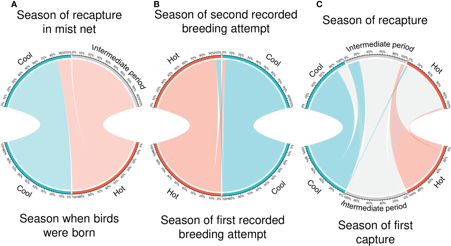 Chord diagrams assessing connectivity between hot and cool populations of the Cape Verde storm-petrel in Cima Islet (Cabo Verde). Hot season is depicted in orange, cool season in blue, and intermediate periods in grey. The bottom of the diagram shows the percentage of individuals that were initially captured in each season while the top shows the percentage of individuals during the period when they were recaptured for (A) birds ringed as chicks; (B) birds ringed as breeding adults and; (C) birds ringed in mist-nets. Sample sizes are summarized in Table 1.