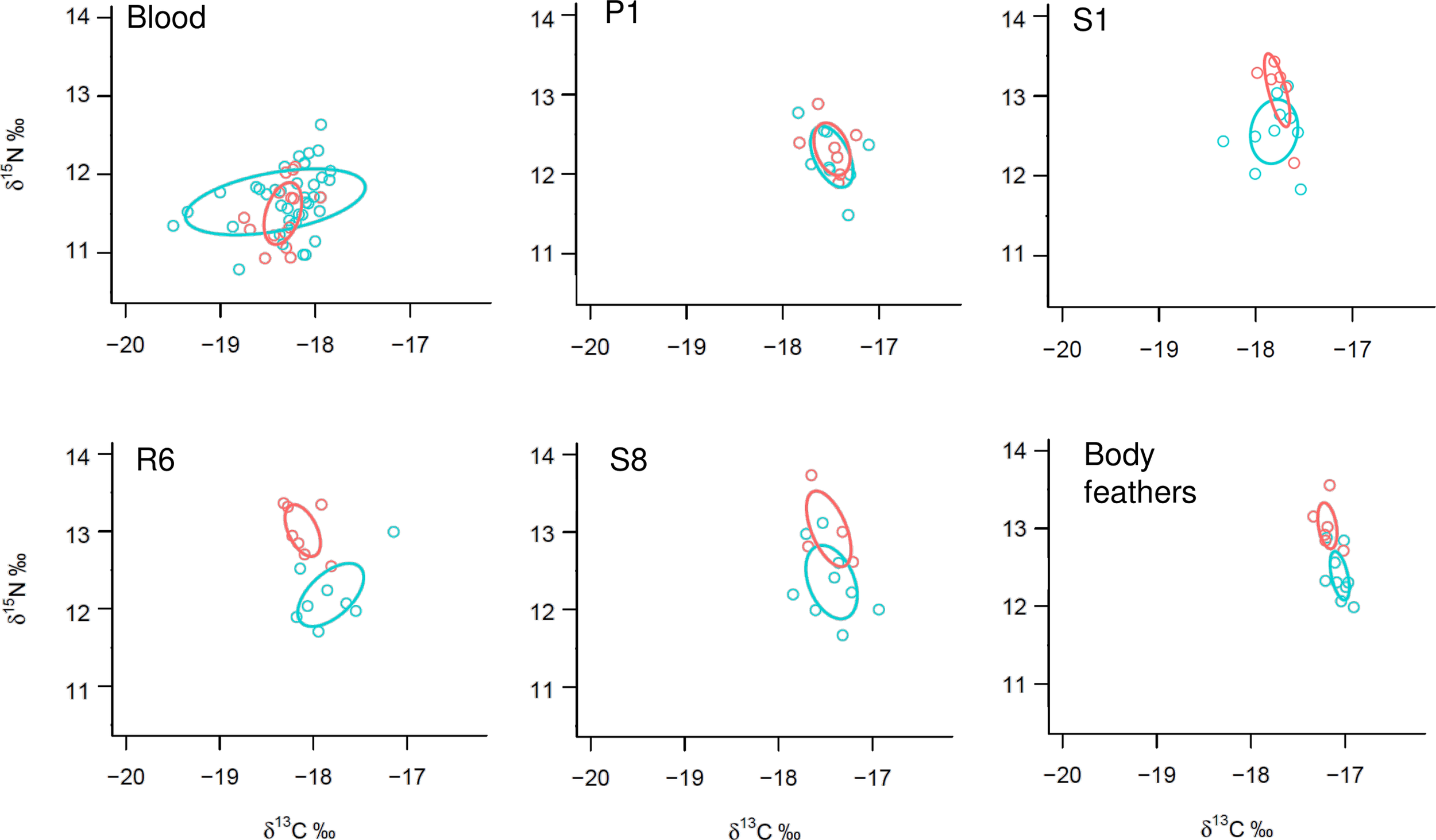 Comparison of the Bayesian Ellipses for stable isotopes of carbon and nitrogen for the hot (orange) and cool (blue) populations of Cape Verde storm-petrels. Stable isotopes were sampled for the breeding areas from blood and the first primary feather (P1), and for the non-breeding areas from the first secondary feather (S1), sixth rectrix (R6), eighth secondary feather (S8) and body feathers. Sample sizes are summarized in Appendix S2.