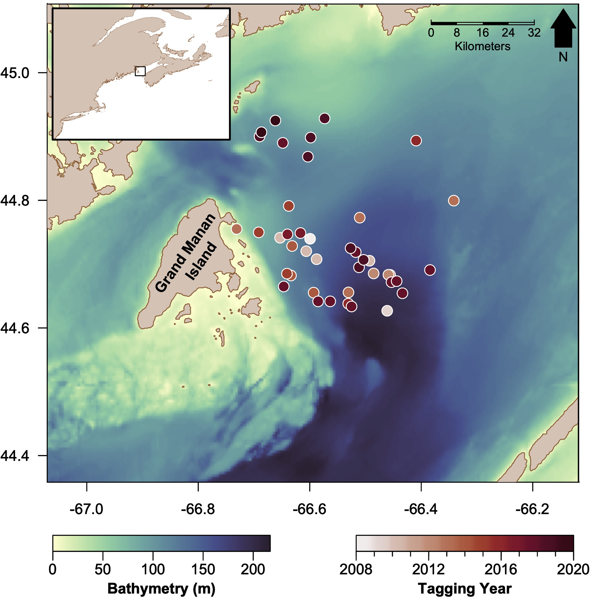 Map of the Bay of Fundy study area, the bathymetry of the basin (darker colors indicate deeper waters), and tagging locations of basking sharks in circles (darker colors indicate more recent years). The inset map (top left) shows the study region (black rectangle) relative to the western North Atlantic coastline.