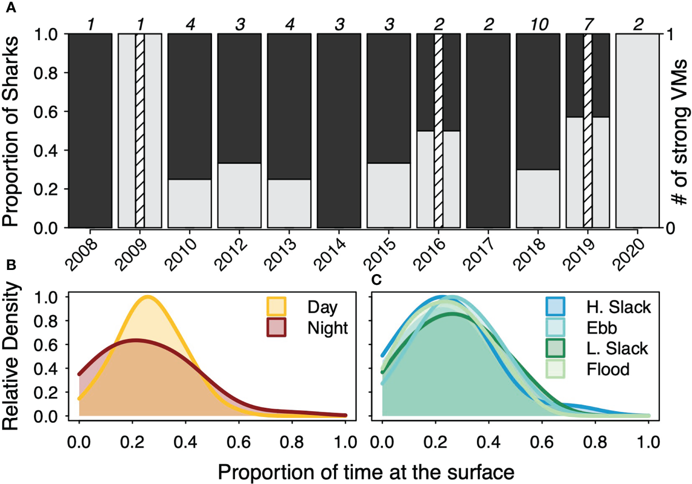 We collated time points that matched the deployment time period to split the time series of surface or subsurface membership into time blocks. The suncalc package (Thieurmel and Elmarhraoui, 2019) was used to calculate sunrise and sunset for each day across each tag time series and used to split the time series into a day period (sunrise to sunset) and into a night period (sunset to sunrise). We then calculated for each of the diel periods the proportion of the time series in the surface and sub-surface components. We then assigned a shark’s vertical migration pattern based on the which diel period had more time at the surface: a diel vertical migrator had more time at the surface in the night time period than the day time period and a reverse diel vertical migrator (RDVM) had the opposite pattern. We then used a test of equal proportions on the tabulation of time at the surface in the diel or tidal time periods. We corrected the total time by the effective sample size for each shark (neff,k) described above in the mixture analysis and assumed a failure was time spent subsurface. If the χ2 test statistic was significant for the diel assignment, we assumed those sharks were strong vertical migrators. We then visualized the proportion of DVM and RDVM as well as strong vertical migrators by year.