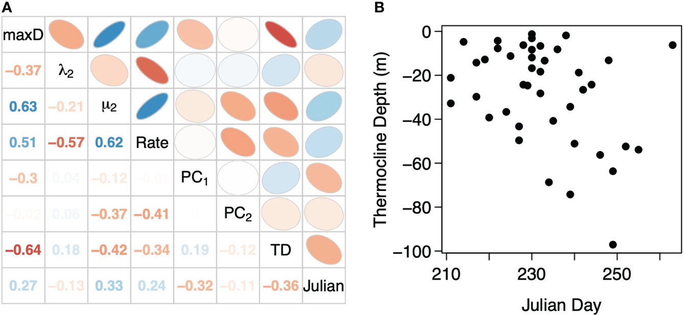 For each metric, we fit nine different models and used BIC model selection to choose the most parsimonious model. The nine different models were combinations of three covariate structures, Julian Day only, thermocline depth, and both Julian Day and thermocline depth as covariates, and three dispersion structures, constant variance, covariance with Julian Day, and covariance with thermocline depth. The deployment duration of each individual was used as a weighting factor in each model, T/max(T), using the glmmTMB package to fit the models (Brooks et al., 2017). Before each model was fit, we used the bestNormalize package to normalize each metric with the exception of λ2 which was logistic-transformed first before doing the normalization (Peterson, 2021). We also Z-standardized Julian day and thermocline depth. For the most parsimonious model, the one with the lowest BIC, we performed a Wald χ2 test to assess the overall significance of this model relative to an intercept-only model, the null hypothesis. From the most parsimonious model, predictions were made for the minimum to the maximum Julian day of deployment or thermocline depth depending on whether the most parsimonious model included these covariates or which had the largest absolute effect size. The mean and 95% confidence interval of the model predictions were calculated and the results visualized.