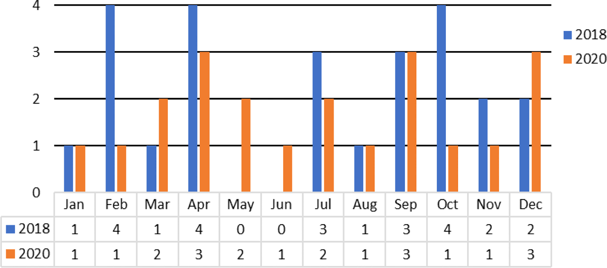 The number of Sentinel-2A images acquired in different months in 2018 and 2020.