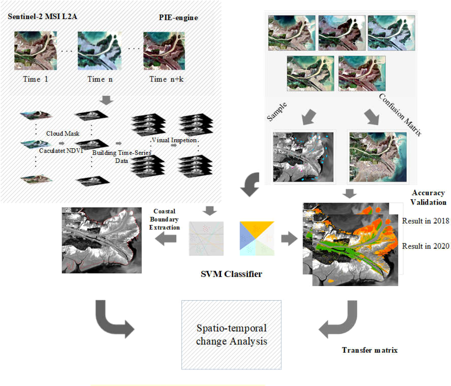 To improve the accurate of monitoring vegetation in the Yellow River Delta wetlands, a method for extracting the wetland vegetation and change analysis using short time series NDVI data set was constructed based on PIE-Engine remote sensing cloud computing platform. Firstly, PIE-Engine was used for cloud screening, cloud removal and calculating the NDVI. Then, the Sentinel-2 images with large cloud coverage were removed by visual screening, and the short time series NDVI data were constructed. Finally, SVM classifier was used to monitor and classify wetland vegetation, and thematic maps of wetland vegetation coverage in 2018 and 2020 were obtained. On this basis, the land cover transfer matrix was calculated to analyze the wetland vegetation pattern and spatio-temporal evolution from 2018 to 2020. The overall flow chart is shown in Figure 3.