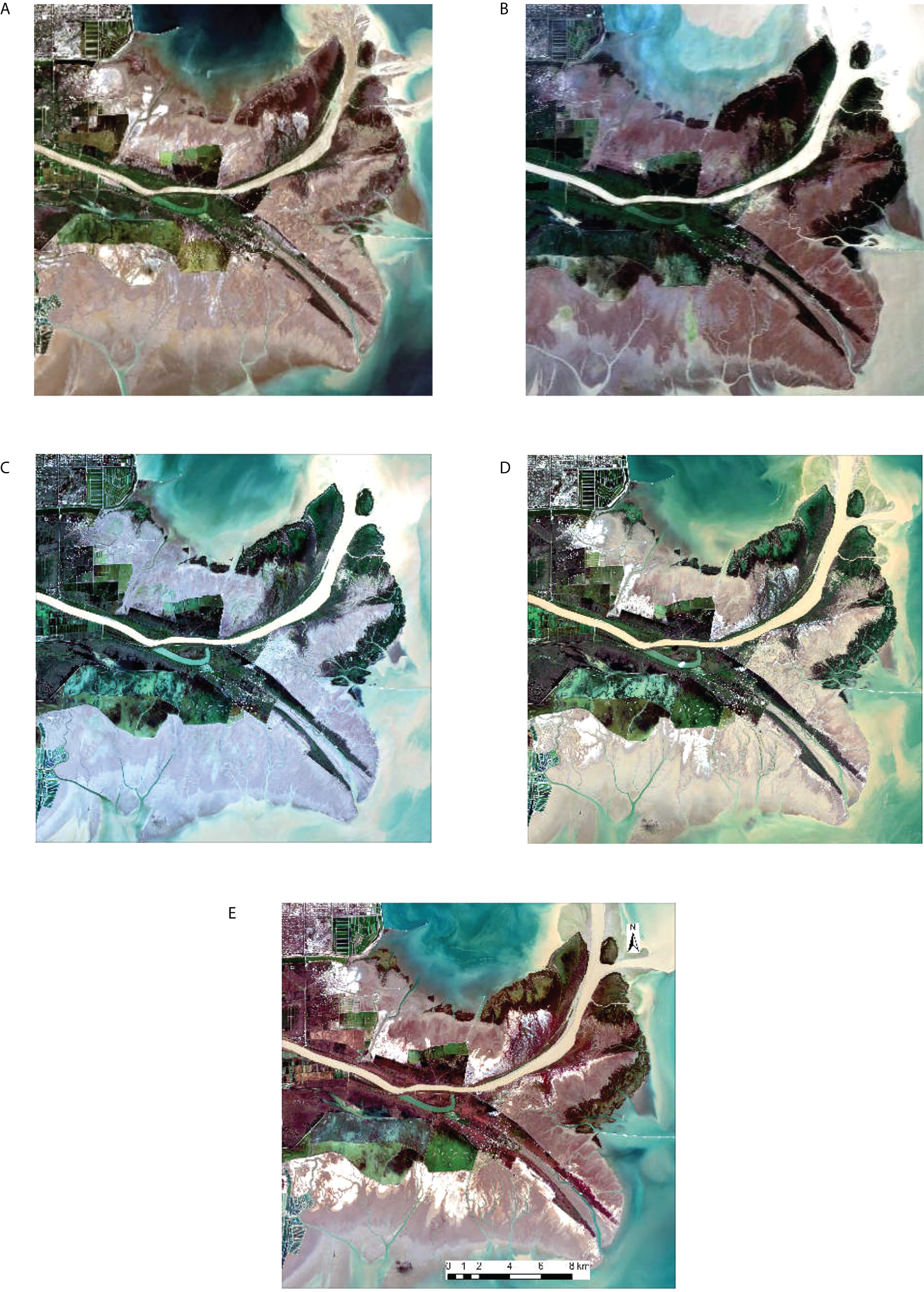Sentinel-2 true-color images of the Yellow River Delta wetlands in 2018. (A) is the true-color image of Sentinel-2A acquired in June; (B) is the true-color image of Sentinel-2A acquired in July; (C) is the true-color image of Sentinel-2A acquired in August; (D) is the true-color image of Sentinel-2A acquired in September; (E) is the true-color image of Sentinel-2A acquired in October.