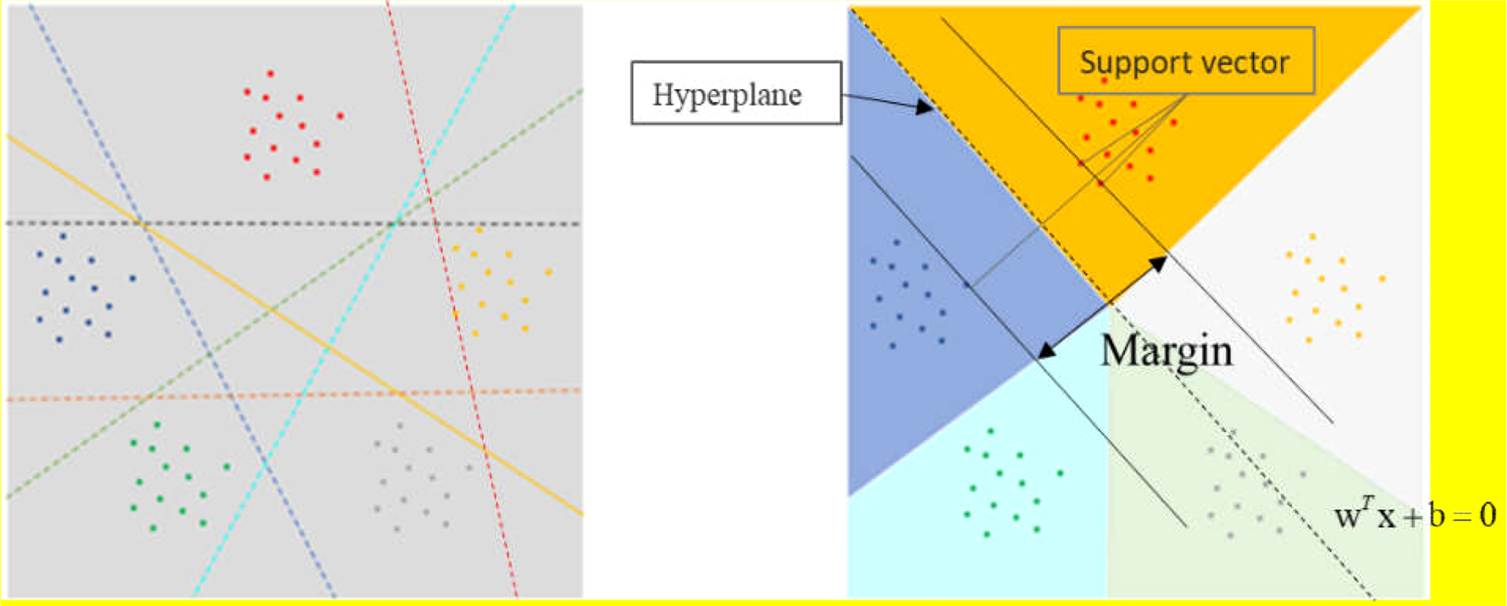 Support Vector Machine (SVM) classifier (Cortes and Vapnik, 1995) is widely used in monitoring the wetland vegetation because it can better deal with the imbalance of wetland vegetation samples (Ahmed et al., 2021; Zhang and Lin, 2022). The SVM classifier firstly normalizes the data, and then the data to be classified is mapped to the factor space of high dimension to find the optimal decision boundary and classify data into different categories. SVM was originally applied to binary classification problems. In two dimensions, two kinds of points that can be completely separated by a line are called linearly separable. The line that extends the two-dimensional space to the multi-dimensional space and divides each category: WTx+b=0 is called the hyperplane, which is the decision boundary of the furthest distance closest to the two types of samples sought by SVM. SVM obtains the optimal decision boundary by maximizing the solution to maximize margin. The binary classification problem is extended to the multi-classification problem, that is, for each class, it is treated as +1 class and all samples of the remaining M-1 classes are treated as -1 class, and a binary SVM is constructed. As shown in the Figure 6 below, for class 1 shown in the red dot, all other categories are regarded as -1 classes and binary SVM is constructed, whose decision boundary is gray dotted line. For the categories shown by the red dot, all other categories are regarded as -1 classes, and binary SVM is constructed, whose decision boundary is a red dotted line. We get others by the similar methods. SVM method classifies nonlinear data by identifying a decision boundary. In the case of non-linear data without linear classification, this decision boundary can increase the dimension of data artificially by using kernel function (Yu et al., 2021).