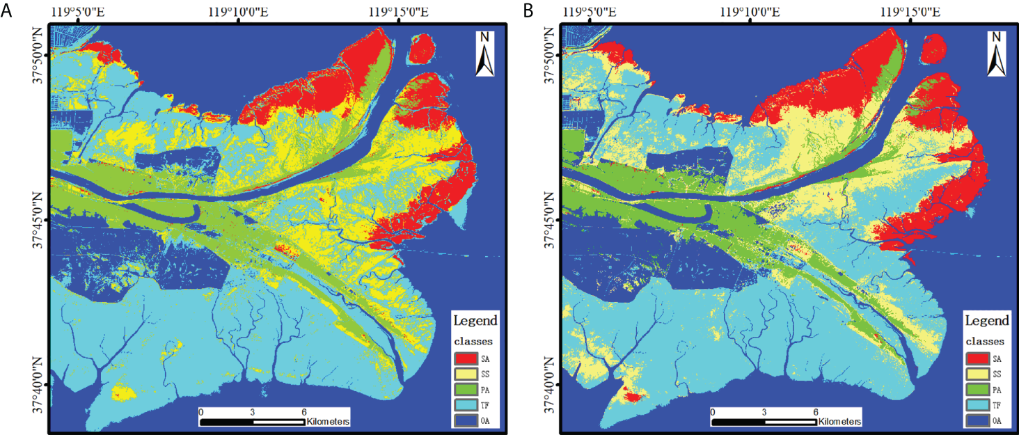 According to 46 Sentinel-2 optical remote sensing images in 2018 and 2020, the wetland types in the Yellow River Delta are classified based on the method constructed in this paper, and the classification results are shown in Figure 7. The classification result in 2018 is shown in Figure 7A, and the classification result in 2020 is shown in Figure 7B. Legends are all represented in the lower right corner of the figures, where the red represents Spartina alterniflora, green represents Phragmites australis, yellow represents Suaeda salsa, sky blue represents Tidal flat, and dark blue represents Open water.