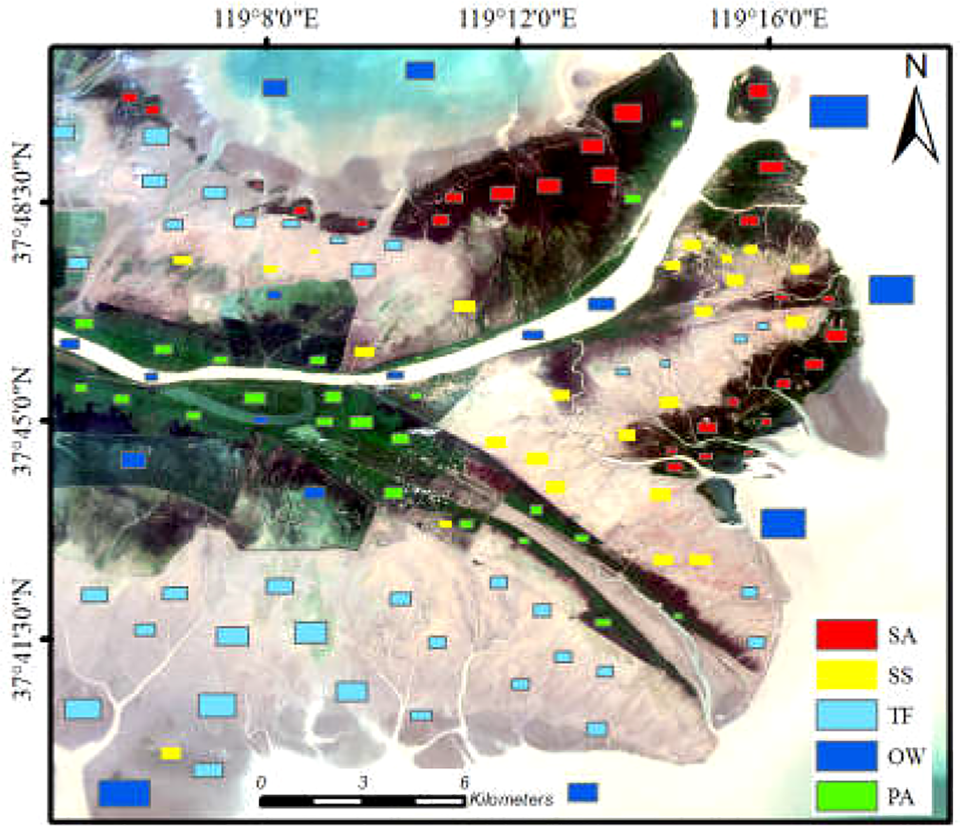 The main vegetation communities in the Yellow River Delta region are rich, mainly including Phragmites australis, Spartina alterniflora and other vegetation suaeda grass is the main surface vegetation in this region. And they can be identified by visual interpretation in remote sensing images. In the classification process of this paper, the land features are classified into five categories, namely Spartina alterniflora (SA), Suaeda salsa (SS), Phragmites australis (PA), Open water (OW) and Tidal flat (TF). Among them, the buildings, saline-alkali land and tidal flats in the region with very similar spectral characteristics are divided into tidal flats. The distribution of Phragmites australis and Spartina alterniflora was relatively concentrated, and there were many intersections. The Sentinel-2 true-color images acquired from June to October in 2018 are shown in Figure 4. It can be seen from the figures that the characteristics of Phragmites australis, Spartina alterniflora and Suaeda salsa in different months are significantly different, and there are obvious seasonal changes. In the Sentinel-2 images from June to August, Phragmites australis was green. In Sentinel-2 images from August to October, Spartina alterniflora was green and Phragmites australis was dark purple. Suaeda salsa matures from October to November, showing “red carpet” on the Sentinel-2 images.
