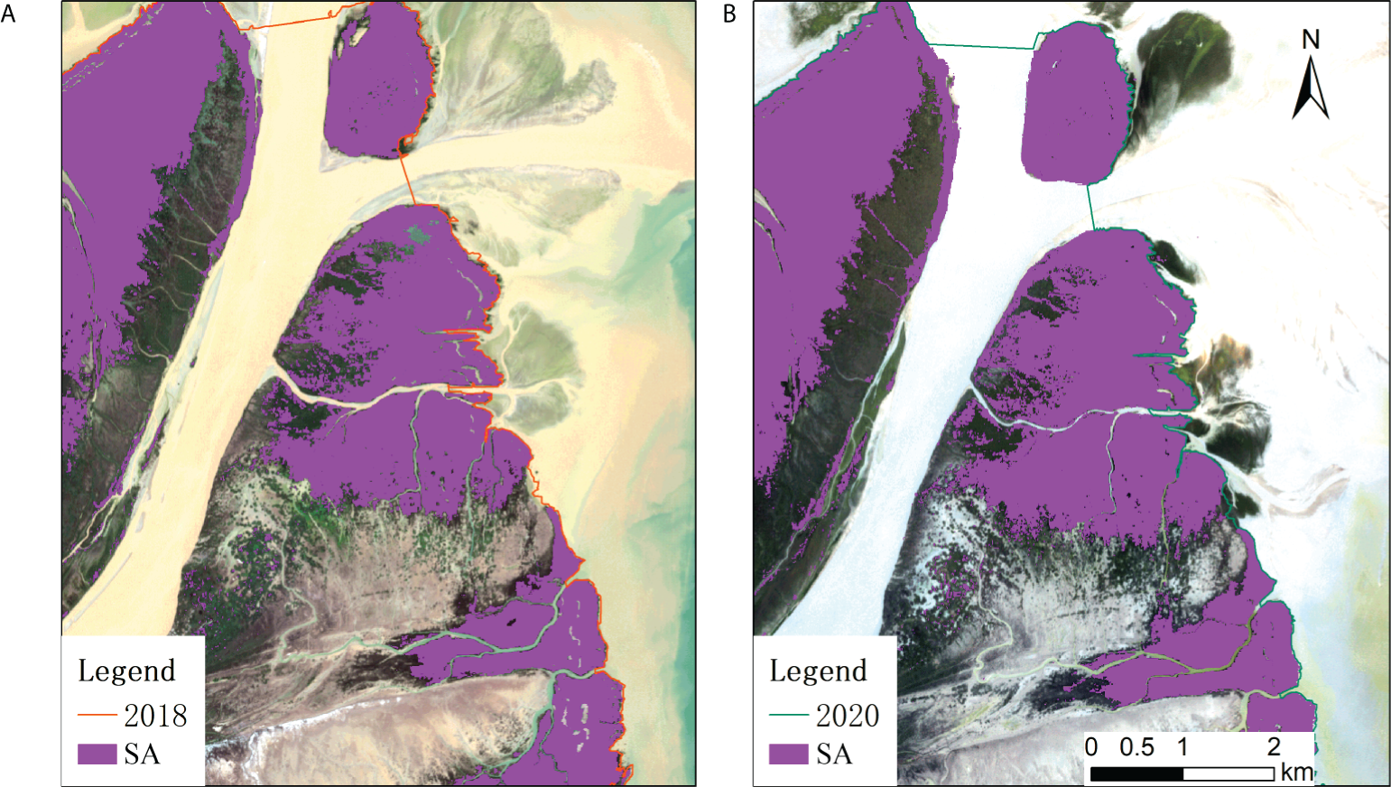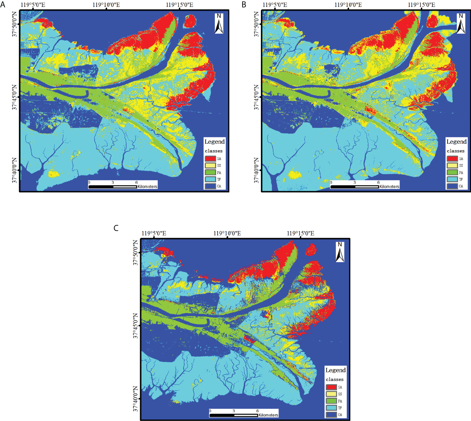 As can be seen from Figure 7, the distribution of ground objects in the Yellow River Delta wetlands was complex. In 2018 and 2020, and a large amount of Spartina alterniflora was distributed along the estuary. At the same time, there was a lot of trivial Suaeda salsa in the Tidal flat, especially in the west of the estuary, but it can be seen that the number of Suaeda salsa is significantly reduced. Phragmites australis were mainly distributed on both sides of the Yellow River channel. There is obvious interlacing between Spartina alterniflora and Phragmites australis near the estuary, and the situation is similar in 2018 and 2020. In general, the cover pattern of wetland vegetation in the Yellow River Delta is as follows: from the coastal edge to the Yellow River channel, the vegetation distribution presents a pattern of “Spartina alterniflora - Suaeda salsa - Phragmites australis”.