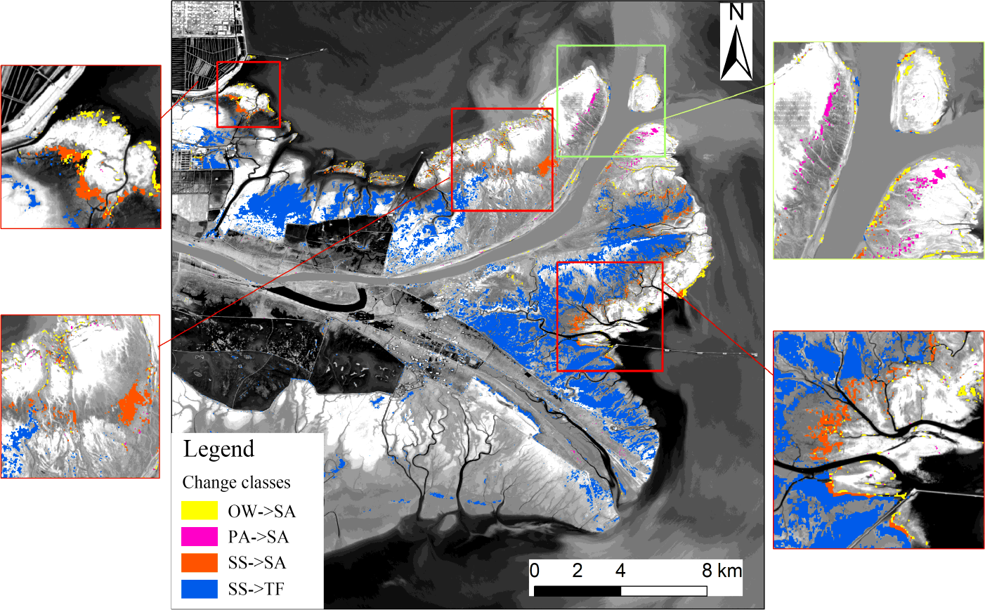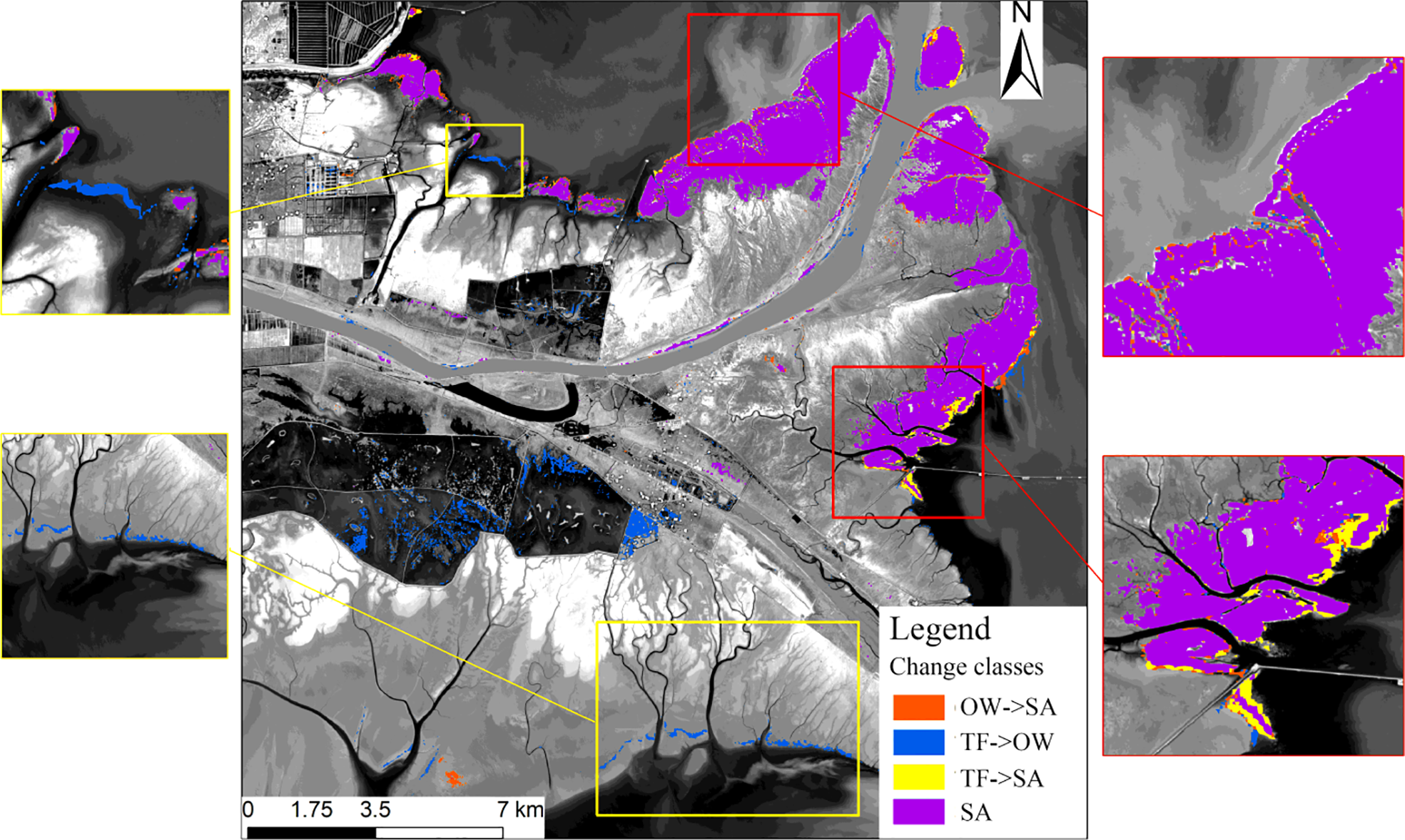 Typical vegetation cover changes map. The yellow represents the change from Open water to Spartina alterniflora. The violet represents the change from Phragmites australis to Spartina alterniflora. The red represents the change from Suaeda salsa to Spartina alterniflora. The blue represents the change from Suaeda salsa to Tidal flat.