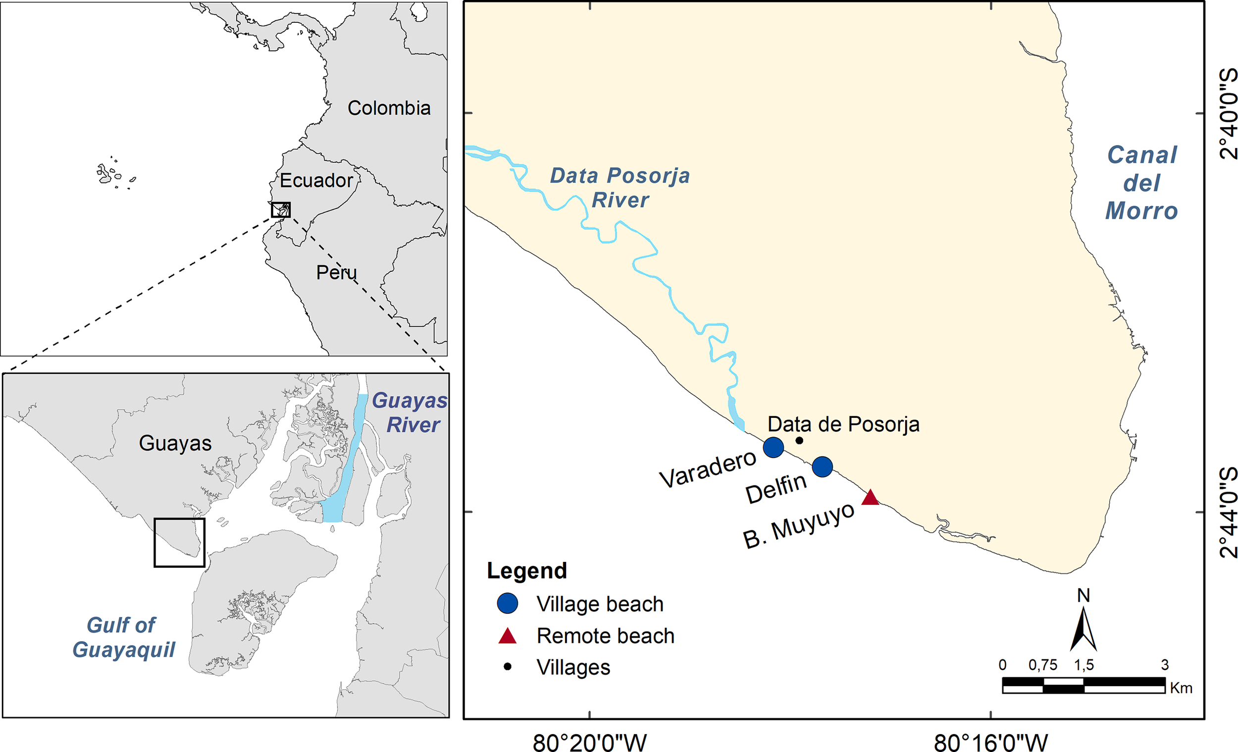 Study area map showing all sampling locations (Varadero, Delfin and Bahia de Muyuyo) on Data de Posorja, Guayas province (Ecuador).