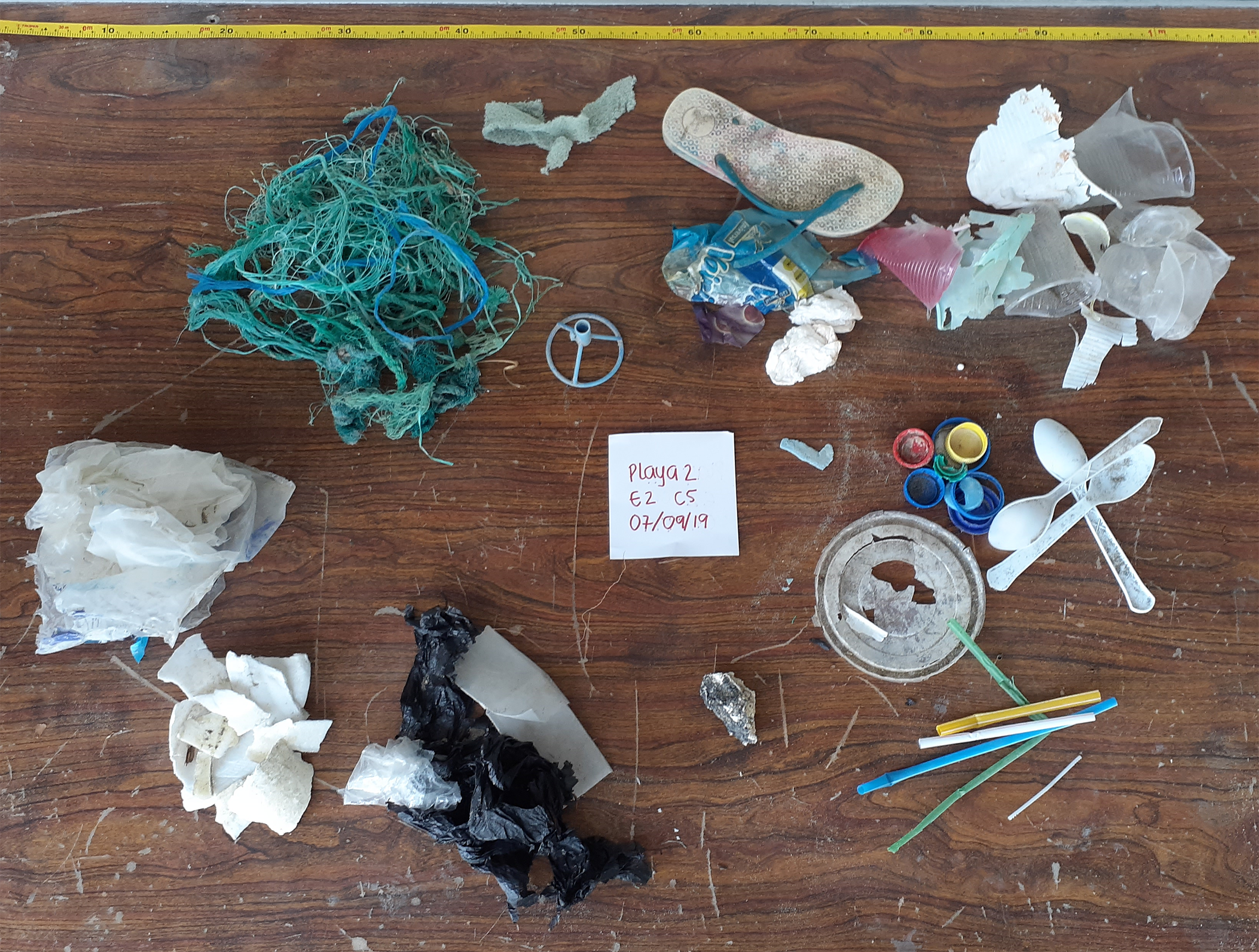The AMD items were classified according to the following categories: plastic, paper, metal, glass, cigarette butts, and others. A metric tape measure was used as a reference to make a photographic record. After the acquisition of the photographic record (Figure 2), distinct types of AMD were counted and recorded on a datasheet to gather the information from each sampled location. Moreover, we calculated the size of AMD items from the photographic record using software ImageJ 1.8.0 (Schneider et al., 2012). By employing the measuring tape on each photo, we set out the scale in cm to estimate the longest size for each AMD item except for fishing ropes, and plastic bags. In addition, we compared the AMD abundance (items/m2) in the beach cross section by grouping stations 1, 2, and 3 to represent the foreshore and stations 4. 5, and 6 to outline the backshore. Then, the average abundance for each section of the beach was determined.